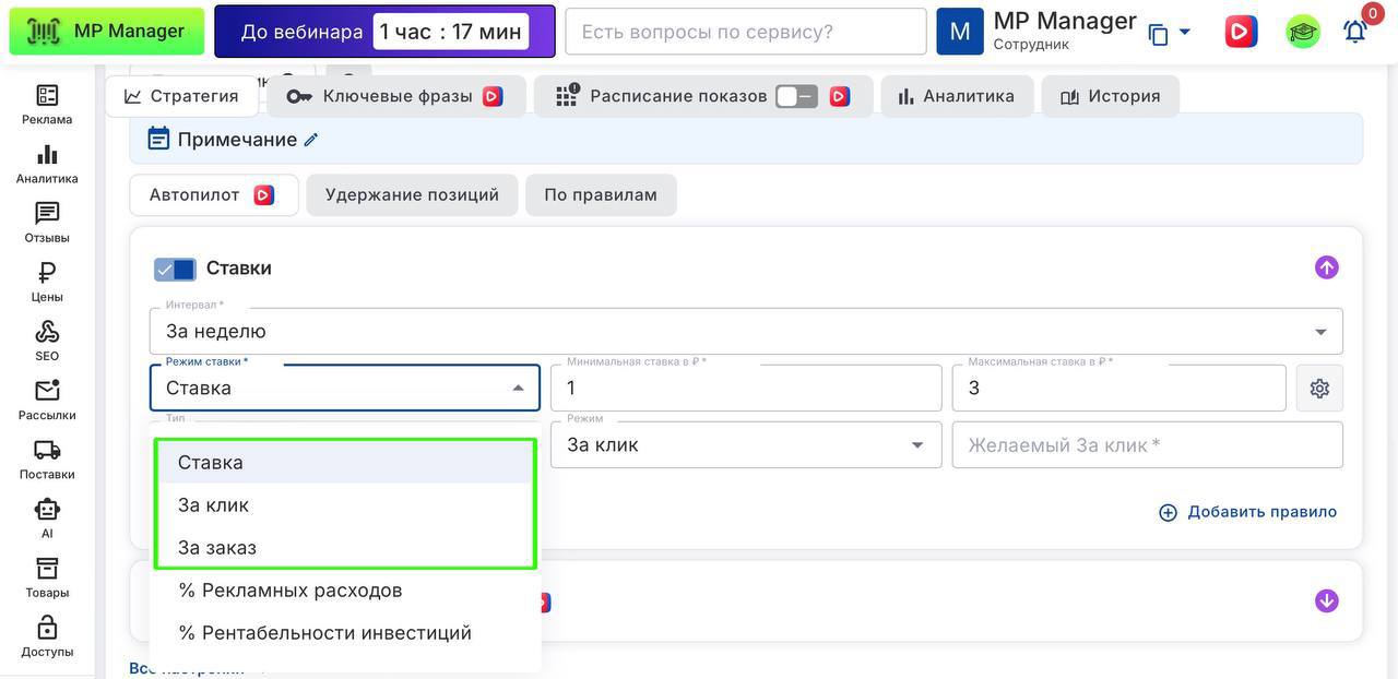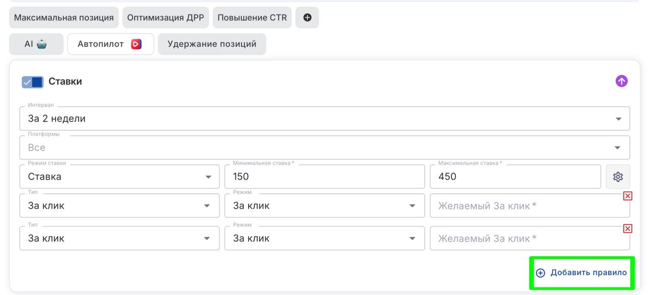 💡 Как это работает: Вы указываете, чего хотите добиться — например, удерживать ставку по клику в пределах 2–3 ₽ и по заказу не больше 3 ₽. Автопилот сам будет балансировать между целями, чтобы уложиться в ваши границы и получить максимум заказов.