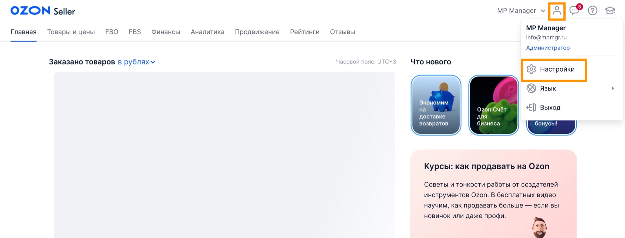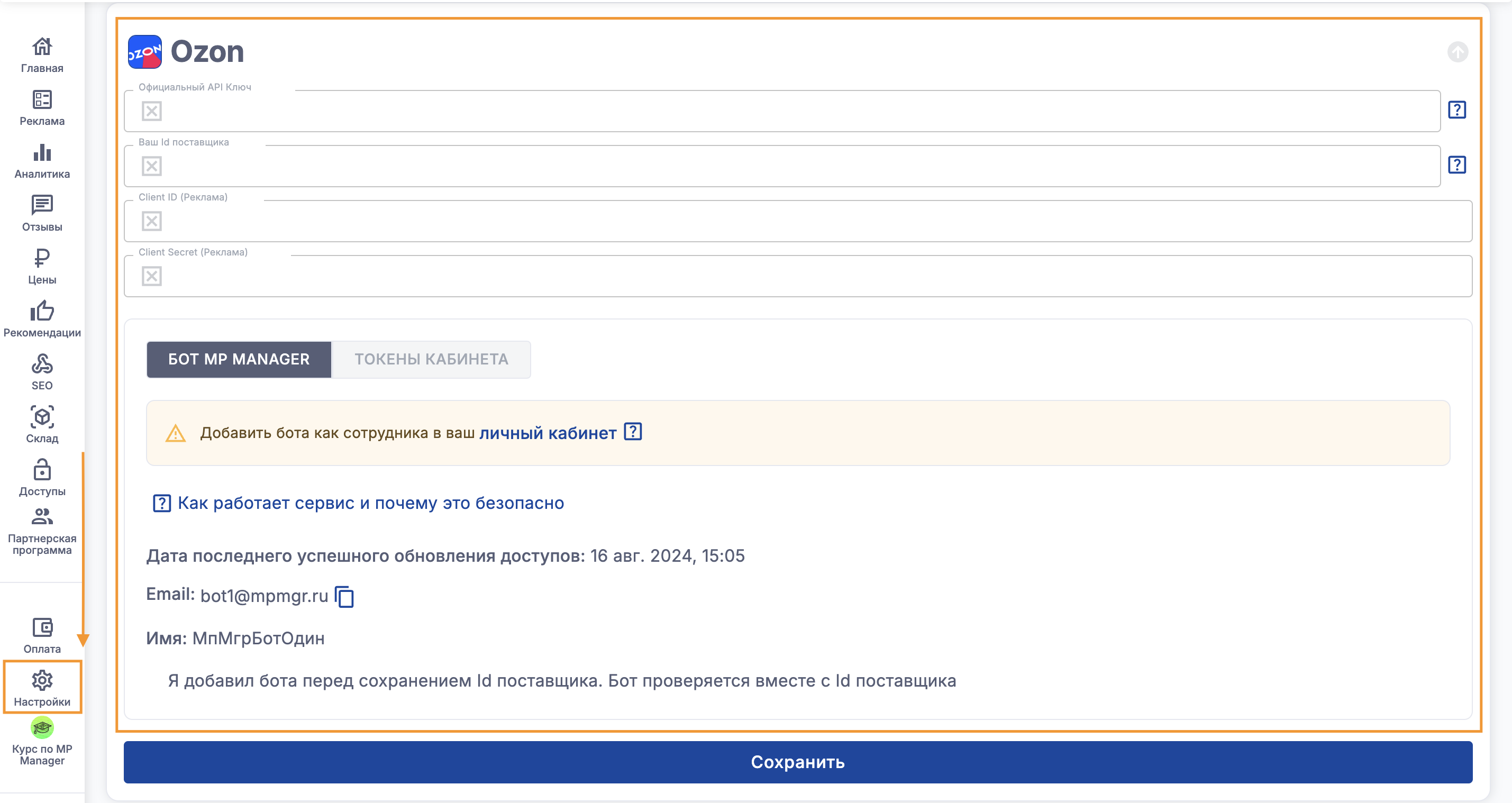 Для подключения Ozon откройте страницу настроек внутри организации и заполните обязательные поля.