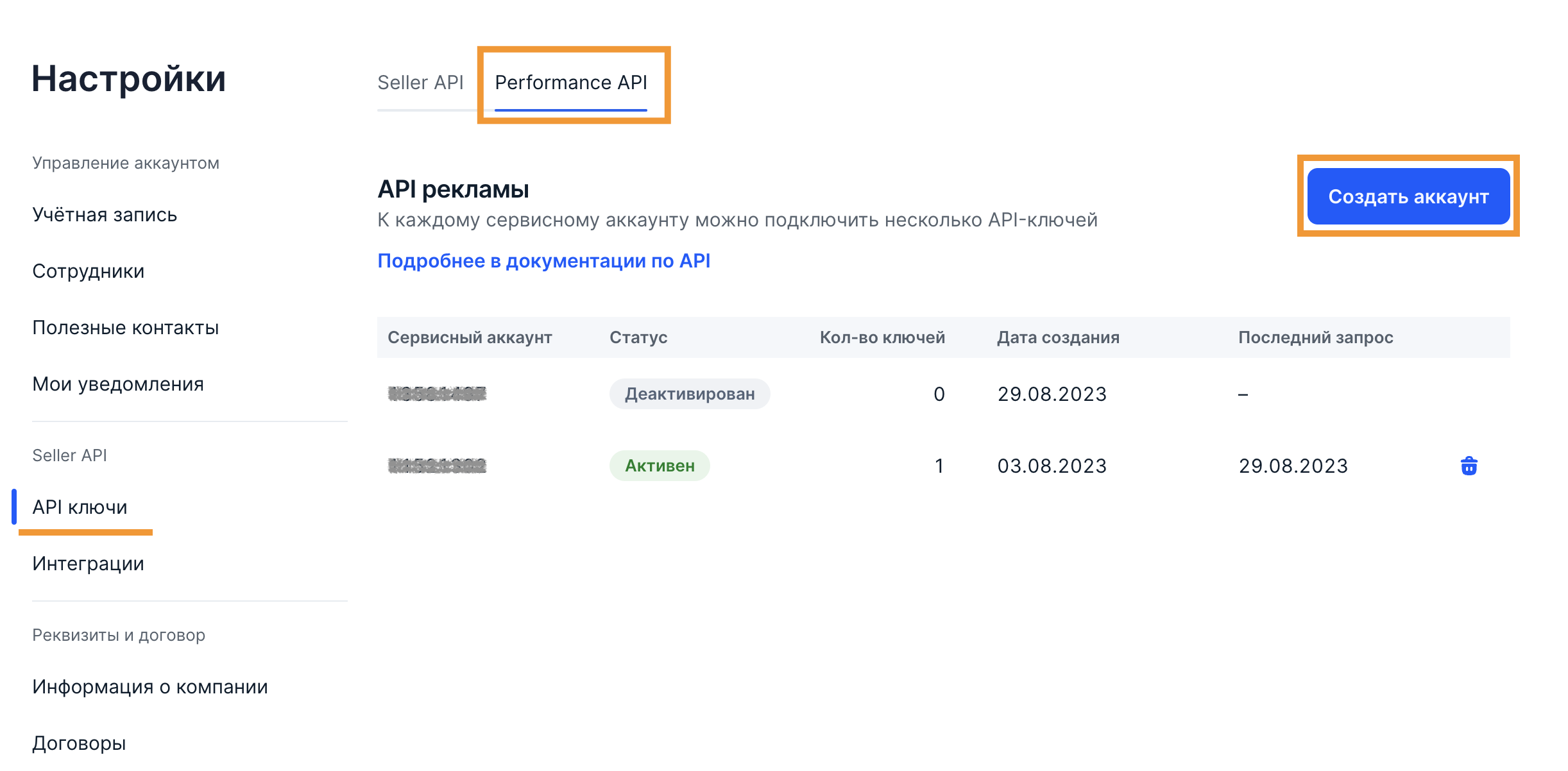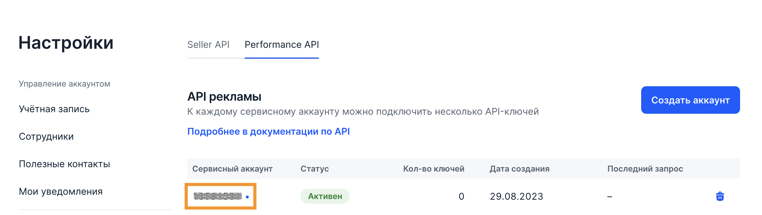 - Выберите вкладку Performance API и нажмите Создать аккаунт