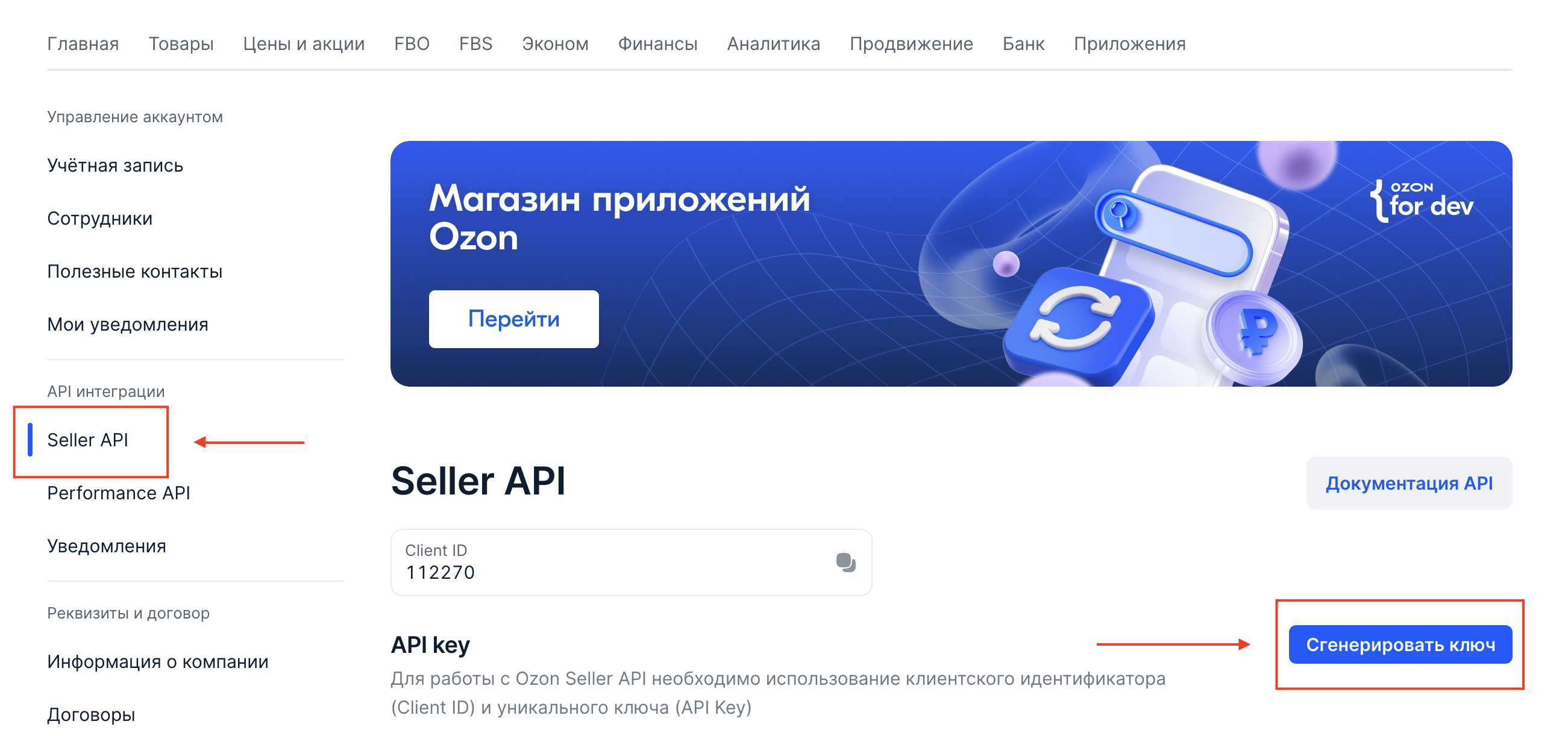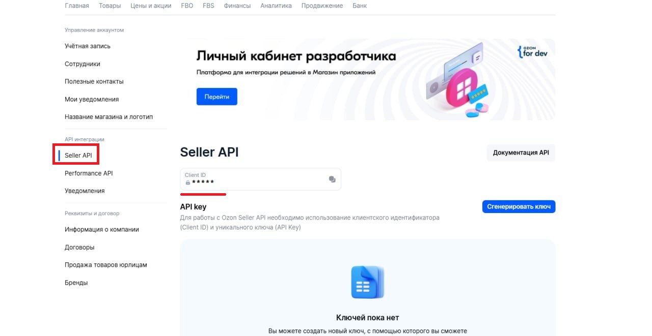 ID поставщика Ozon можно найти на странице настроек во вкладке API ключи