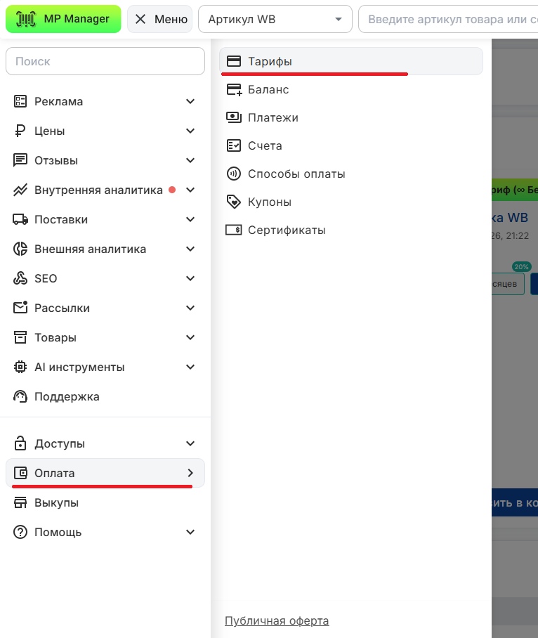 - На странице сервиса перейдите в раздел Оплата → Тарифы