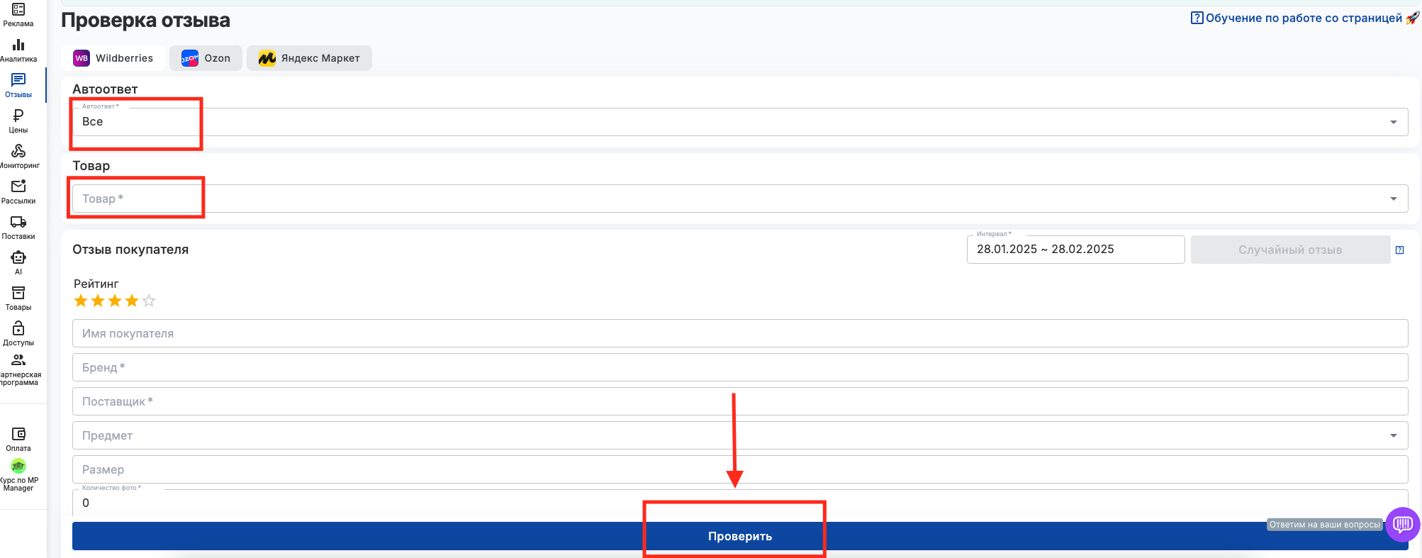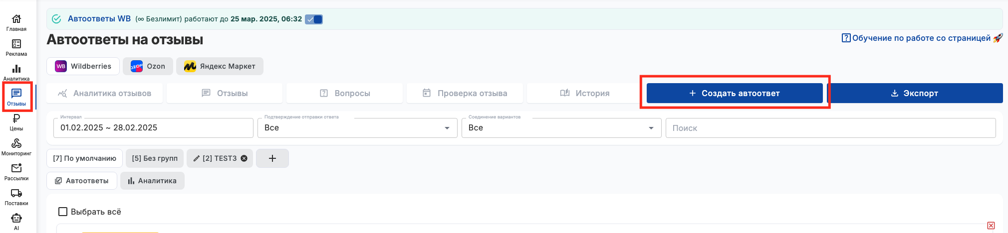 Дата отзыва - Если не выбирать даты, сервис будет отвечать на все отзывы подходящие под другие условия. Сервис будет отвечать и на старые отзывы, но на ВБ есть ограничение на возможность ответить до месяца