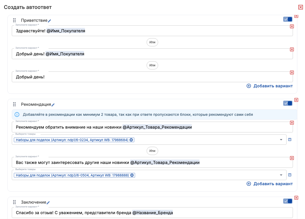 в данном блоке помимо текста и указанных выше тегов также можно вставить один или несколько тегов @Артикул_Товара_Рекомендации и выбрать товары для подстановки вместо этого тега в ответе на отзыв.
