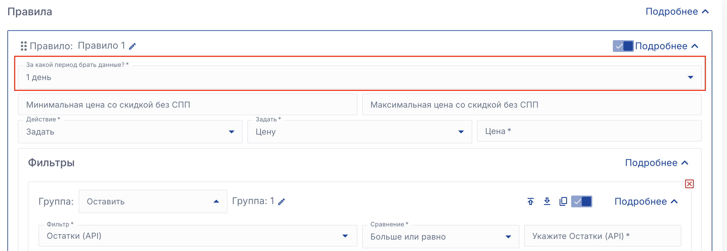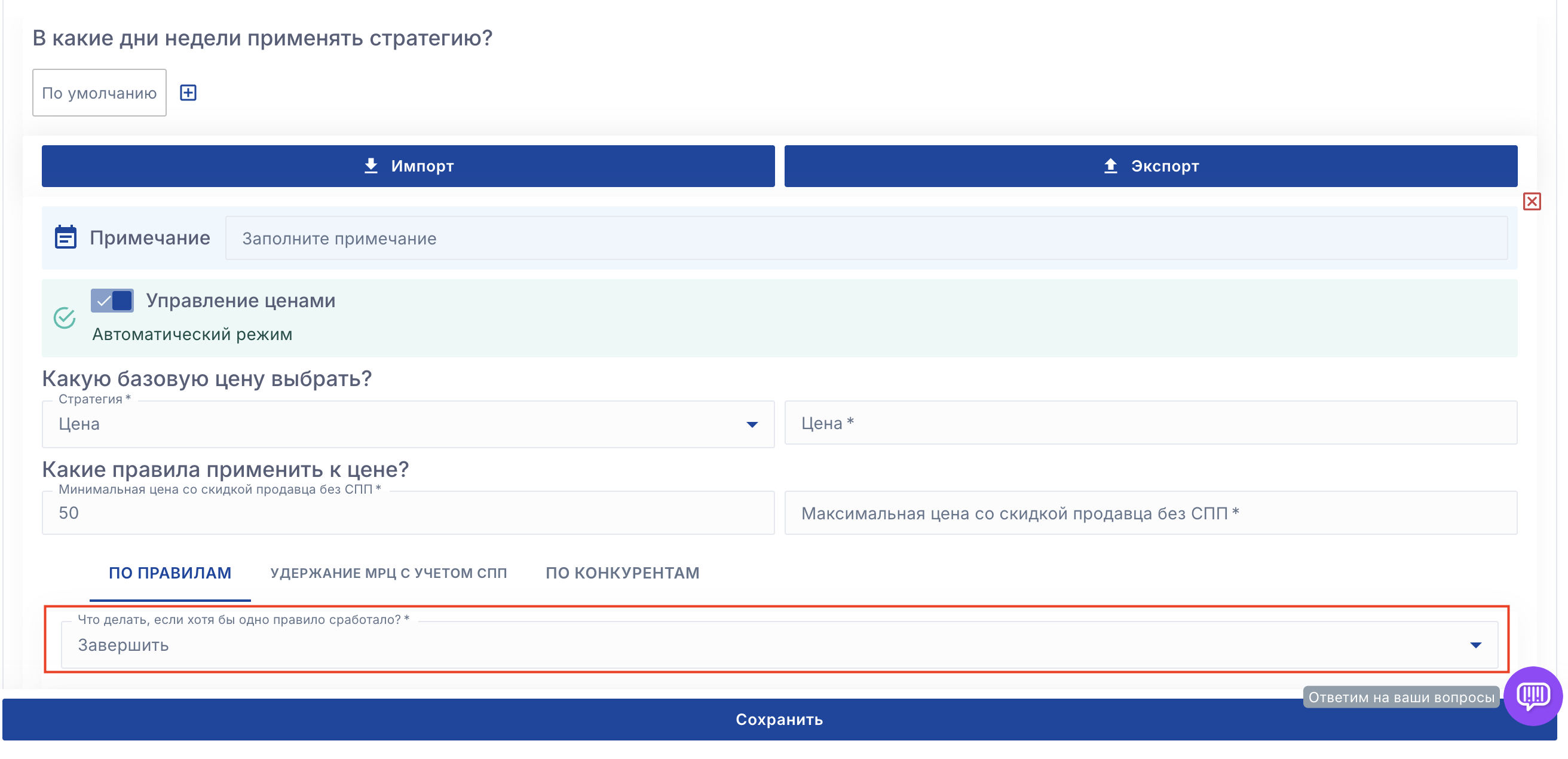 Обращайте внимание на эту настройку при настройке стратегии управления ценами. Если по вашим условиям сервис должен изменить цену более чем на 20%, но вы выбрали "не изменять цену" в пункте 5, то сервис не применит нужную цену