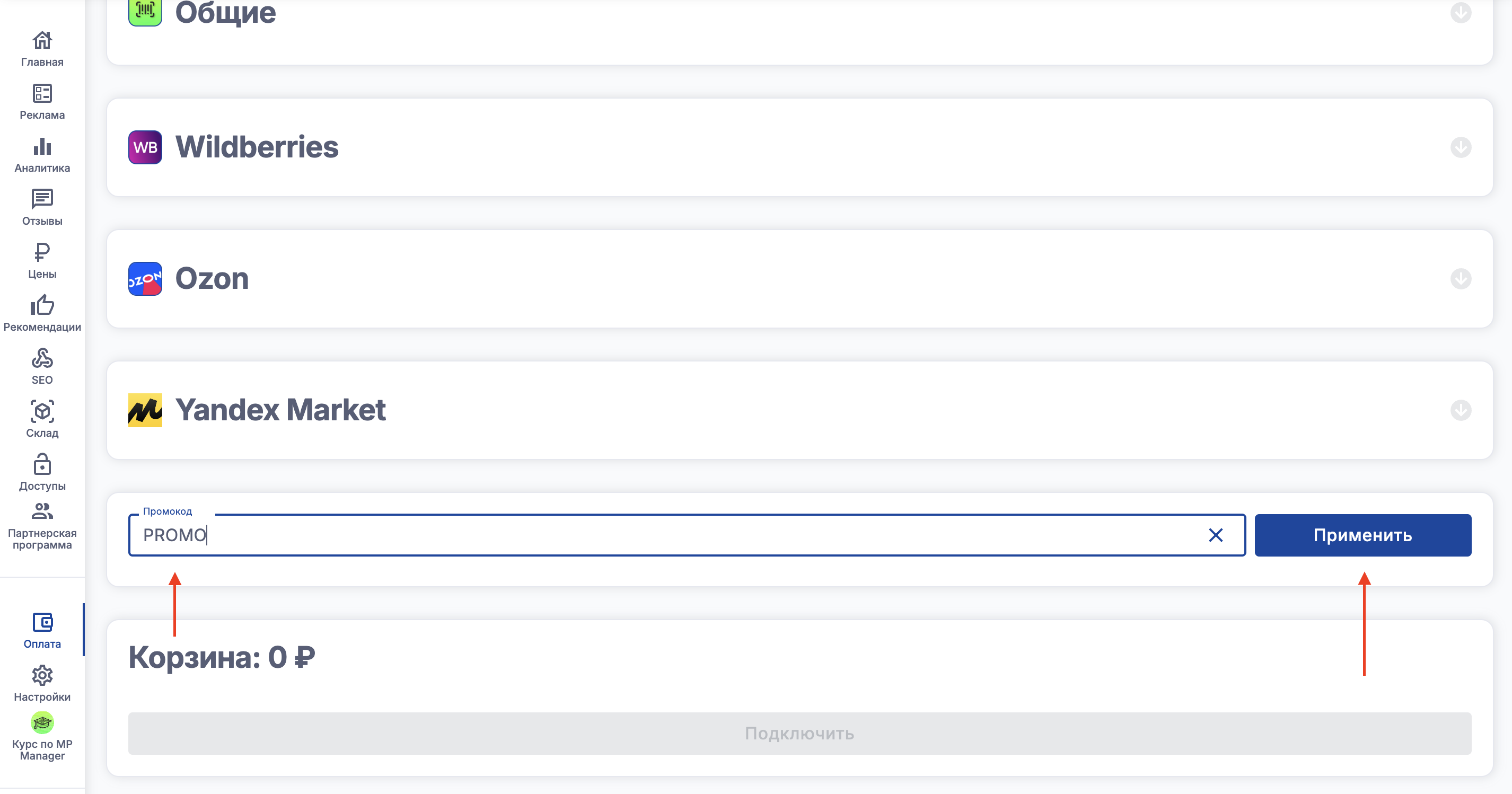 Промокоды применяются на странице "Оплата", в разделе "Тарифы", нужно ввести промокод и нажать "Применить"