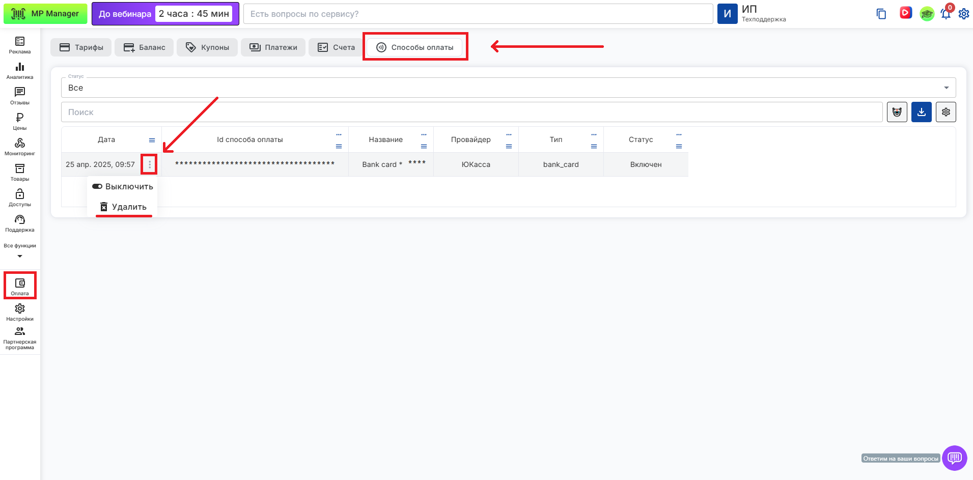 Для удаления способа оплаты, достаточно зайти в раздел "Оплата" - Вкладка "Способы оплаты" - и удалить добавленный способ оплаты