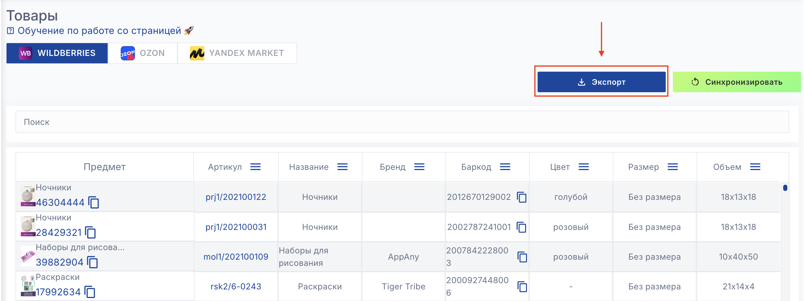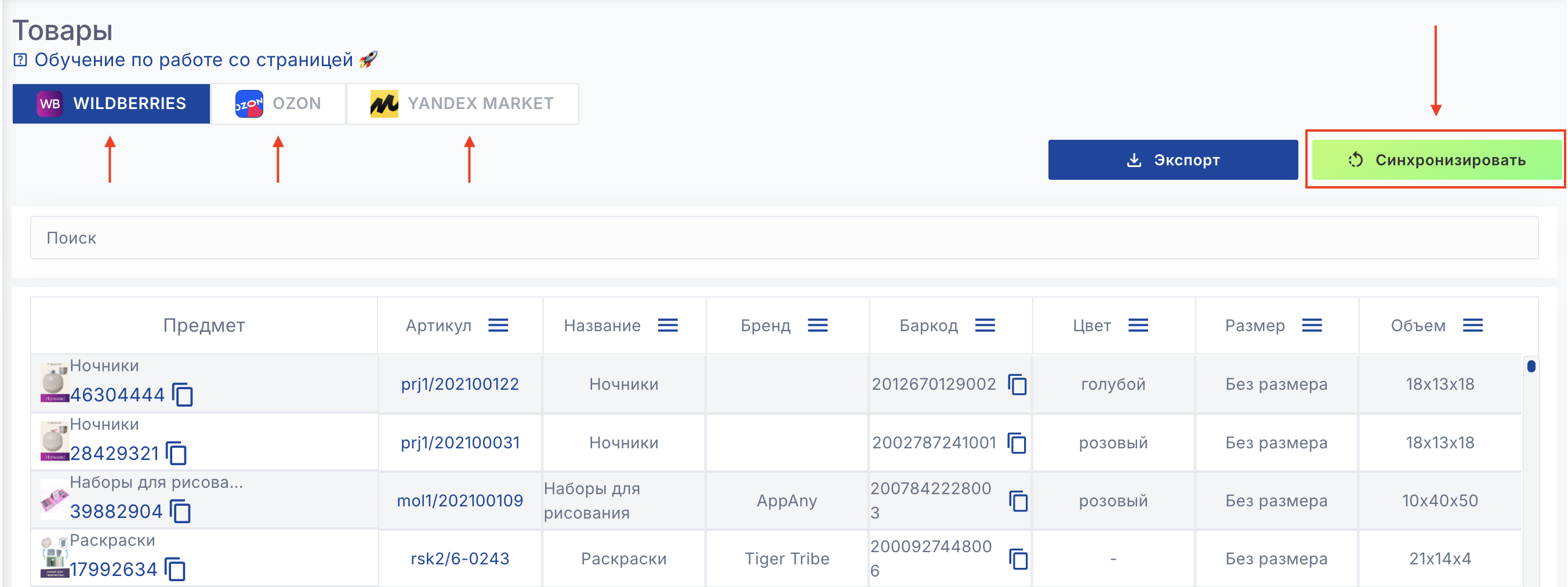 Если товаров нет или каких-то товаров не хватает (также и на других страницах) - нажмите "Синхронизировать"