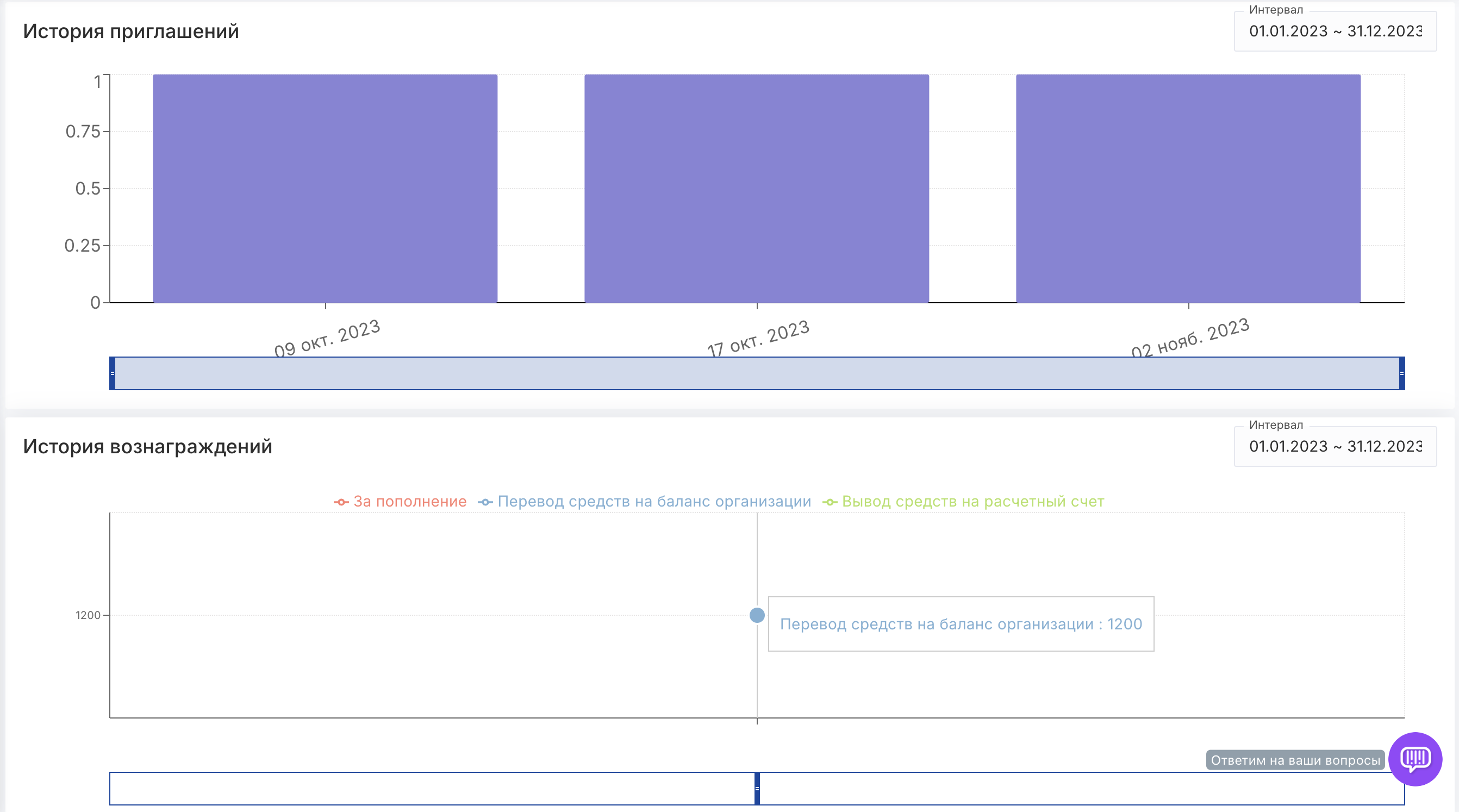 История приглашений и вознаграждений будет также отображаться на странице "Партнерская программа"