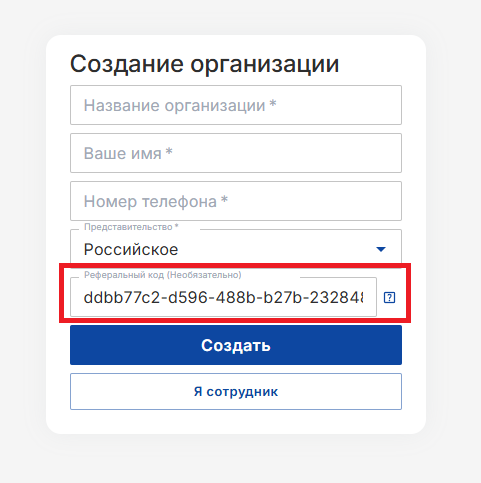 - Реферальный код нужно ввести при создании организации