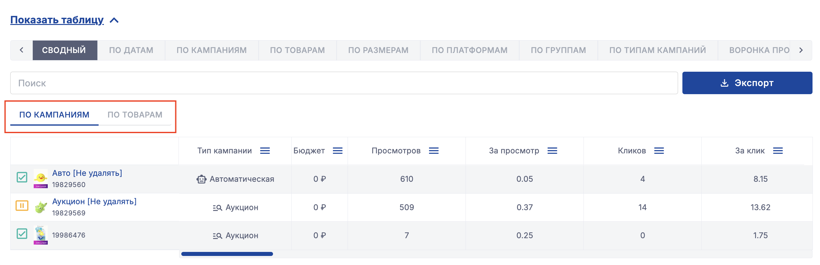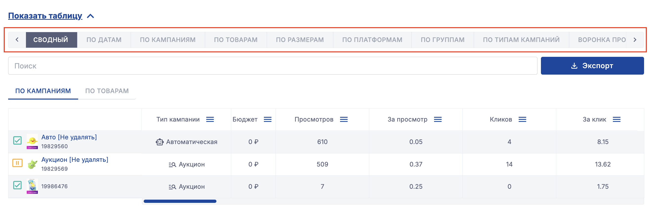 Или посмотреть данные по кампаниям, в которых есть определенный товар