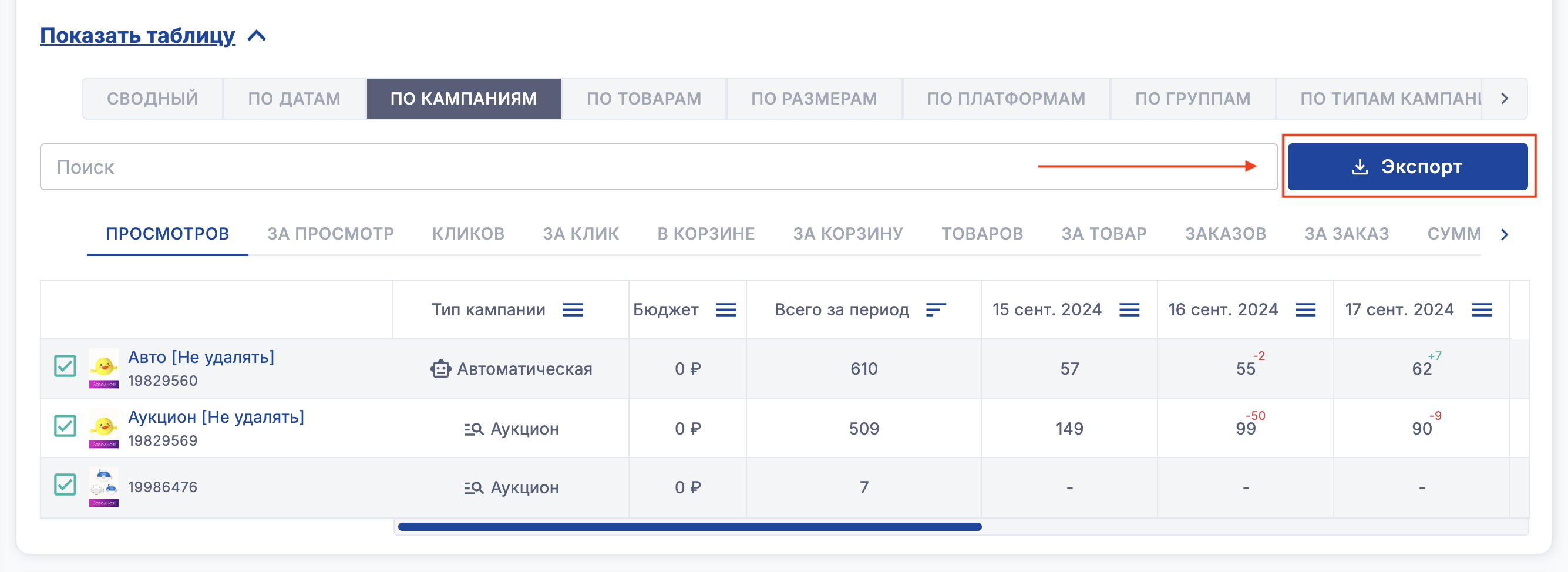 Можно проанализировать общий график просмотров, кликов, %кликов, цене за клик и остальным показателям сразу по всем товарам во всех рекламных кампаниях либо по отдельному товару во всех/ в нескольких/ в каждой кампании отдельно на любые даты с возможностью экспорта
