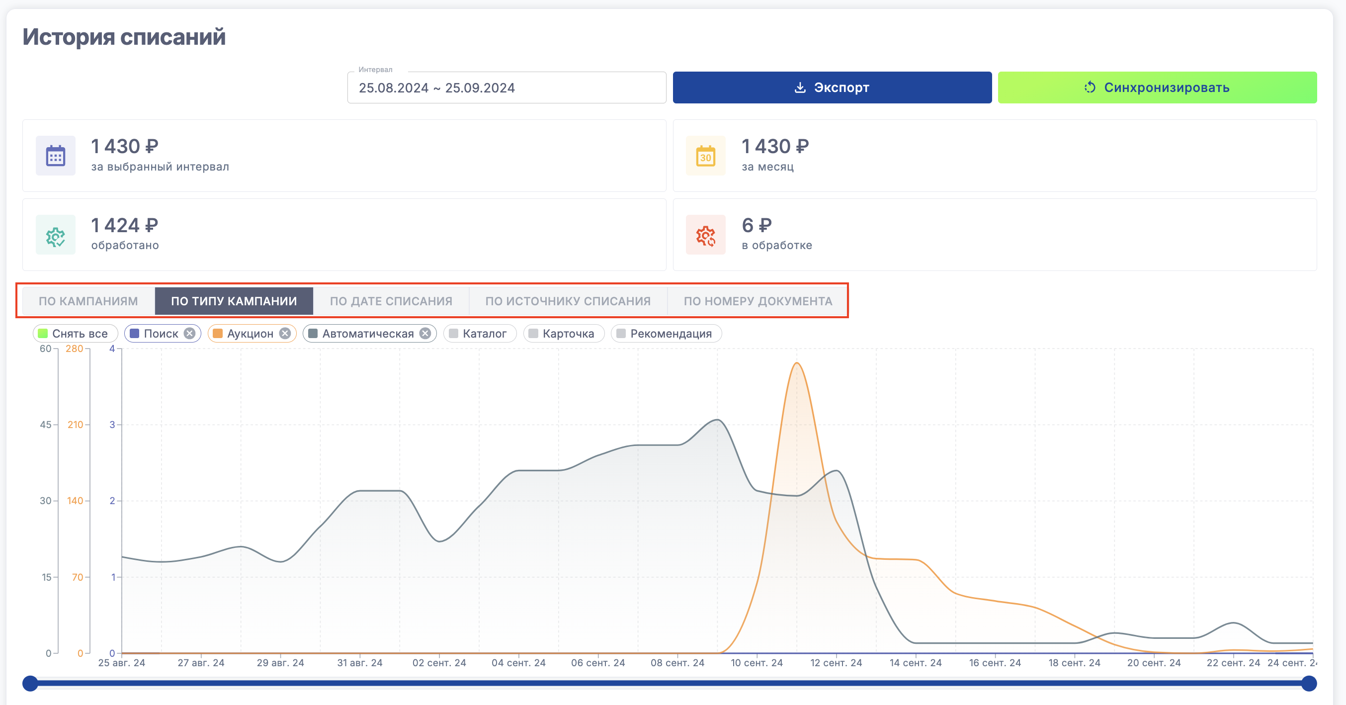 Ниже находится график списаний за выбранный интервал с возможностью группировки по кампаниям, по типу кампании, по дате списания, по источнику списания, по номеру документа