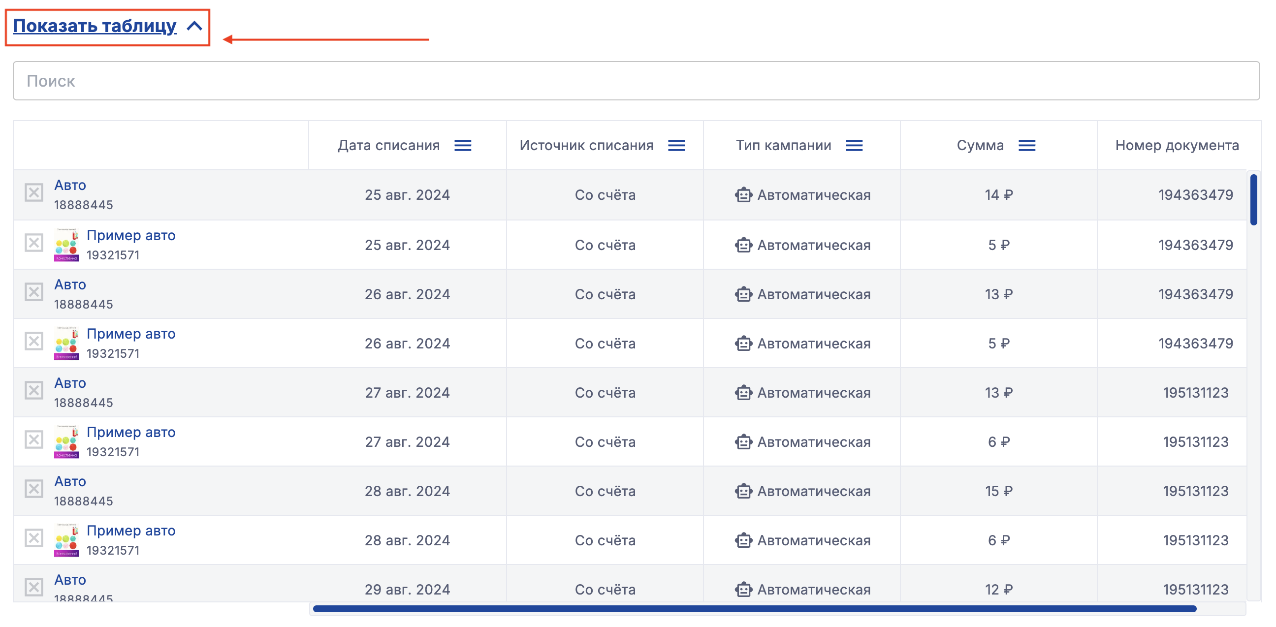 Для отображения табличной части, нажмите "Показать таблицу"