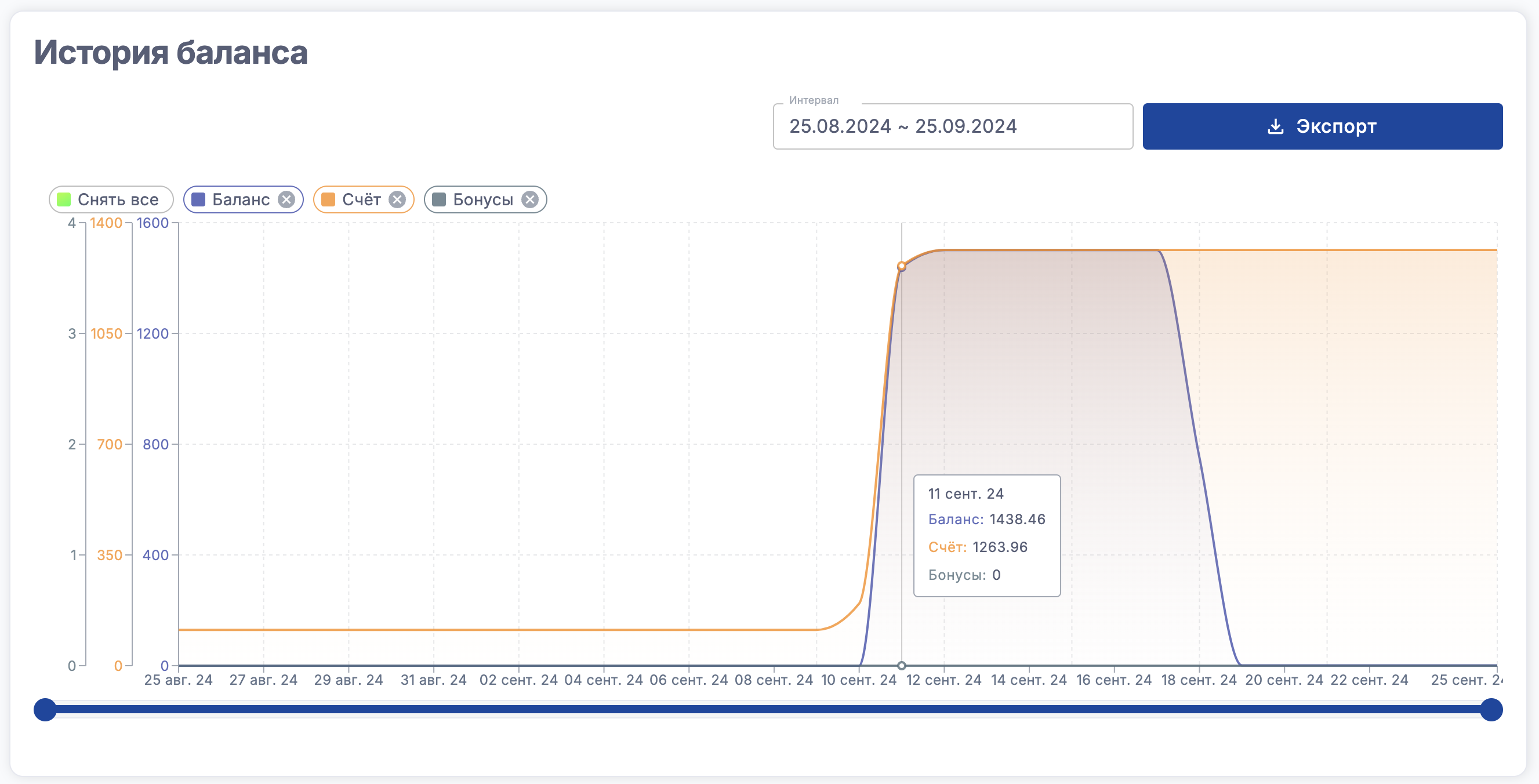 График показывает историю изменения баланса, счета и бонусов в рекламном кабинете Wildberries