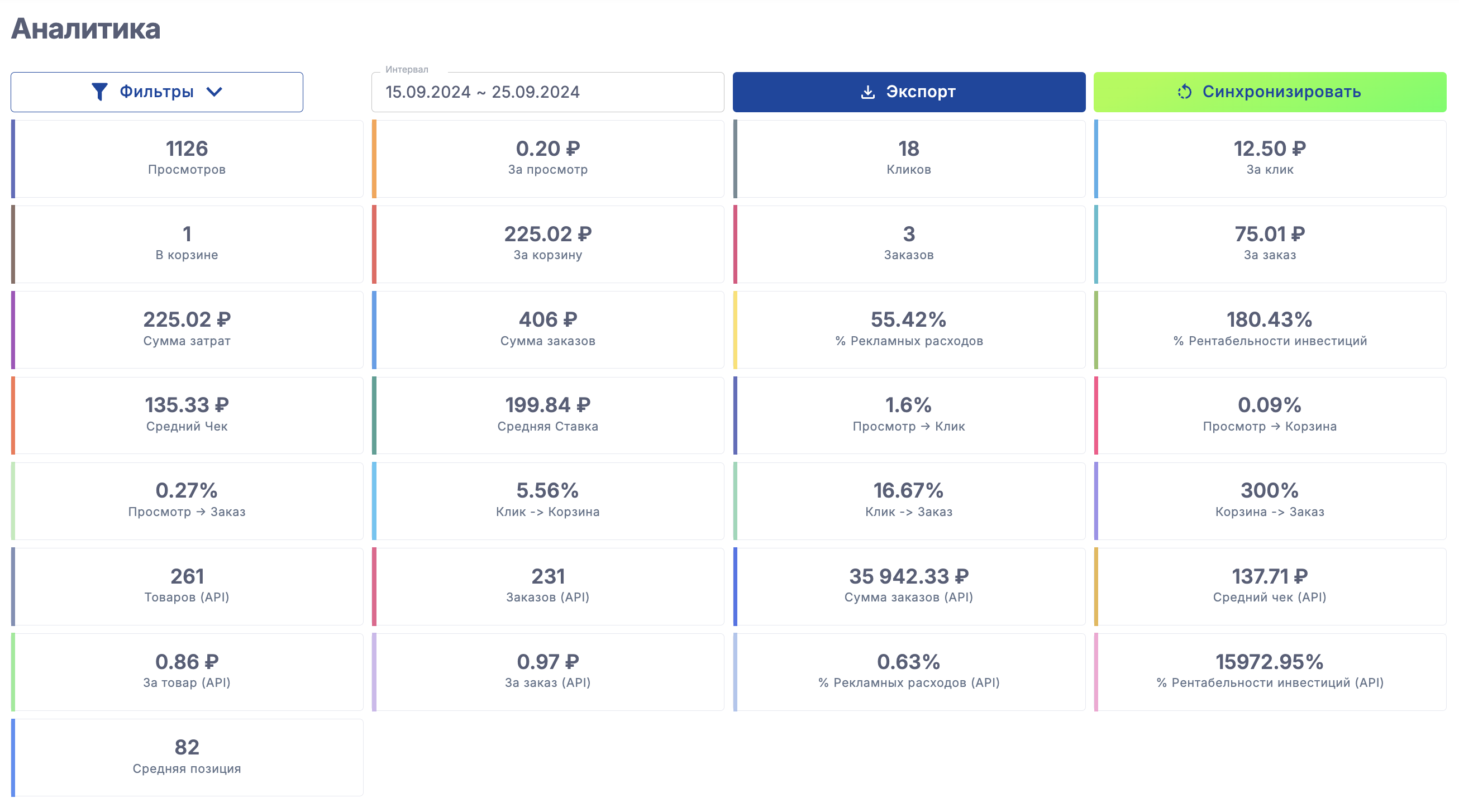 (API) - показатели рассчитываются на основе общих заказов рекламы и органики из API. Если подписи (API) нет, значит показатель рассчитывается на основе заказов только из рекламных кампаний