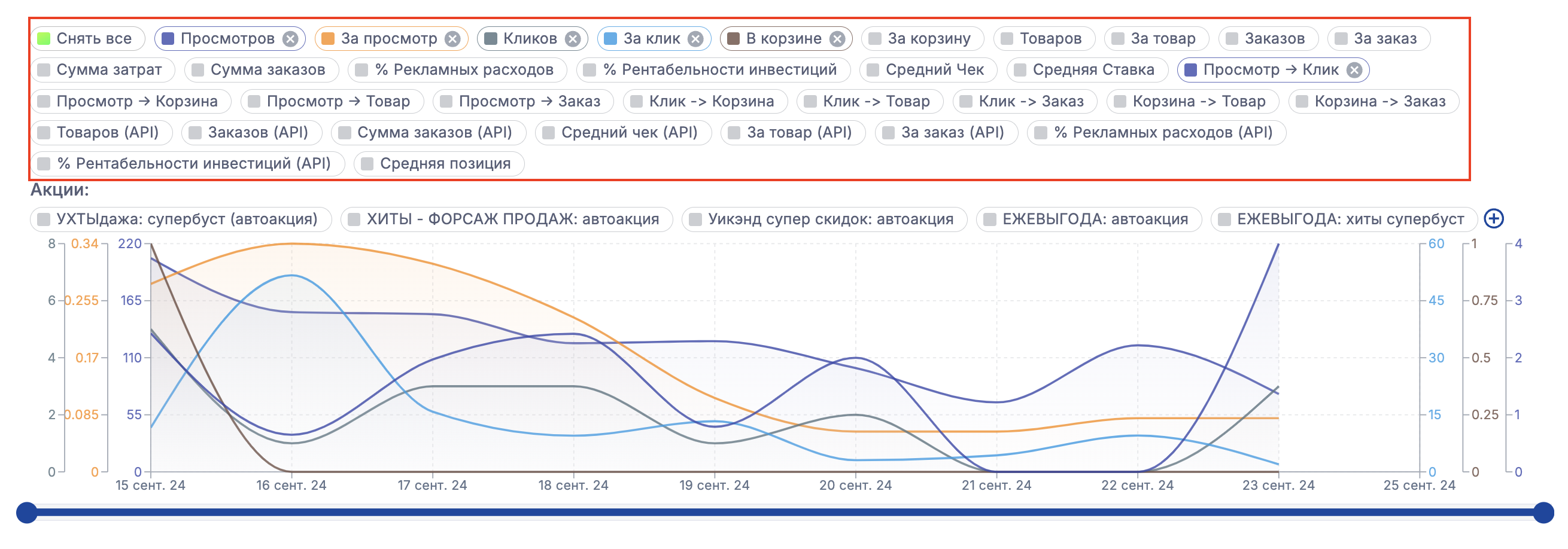 На графике отображаются все акции, проходившие в выбранный интервал времени. При необходимости вы можете убрать некоторые или все акции