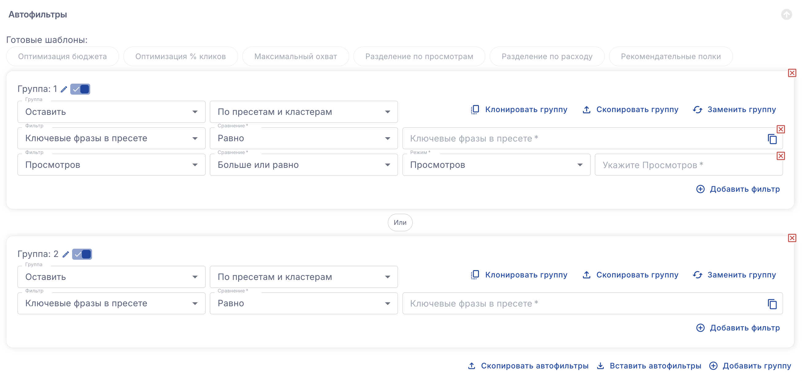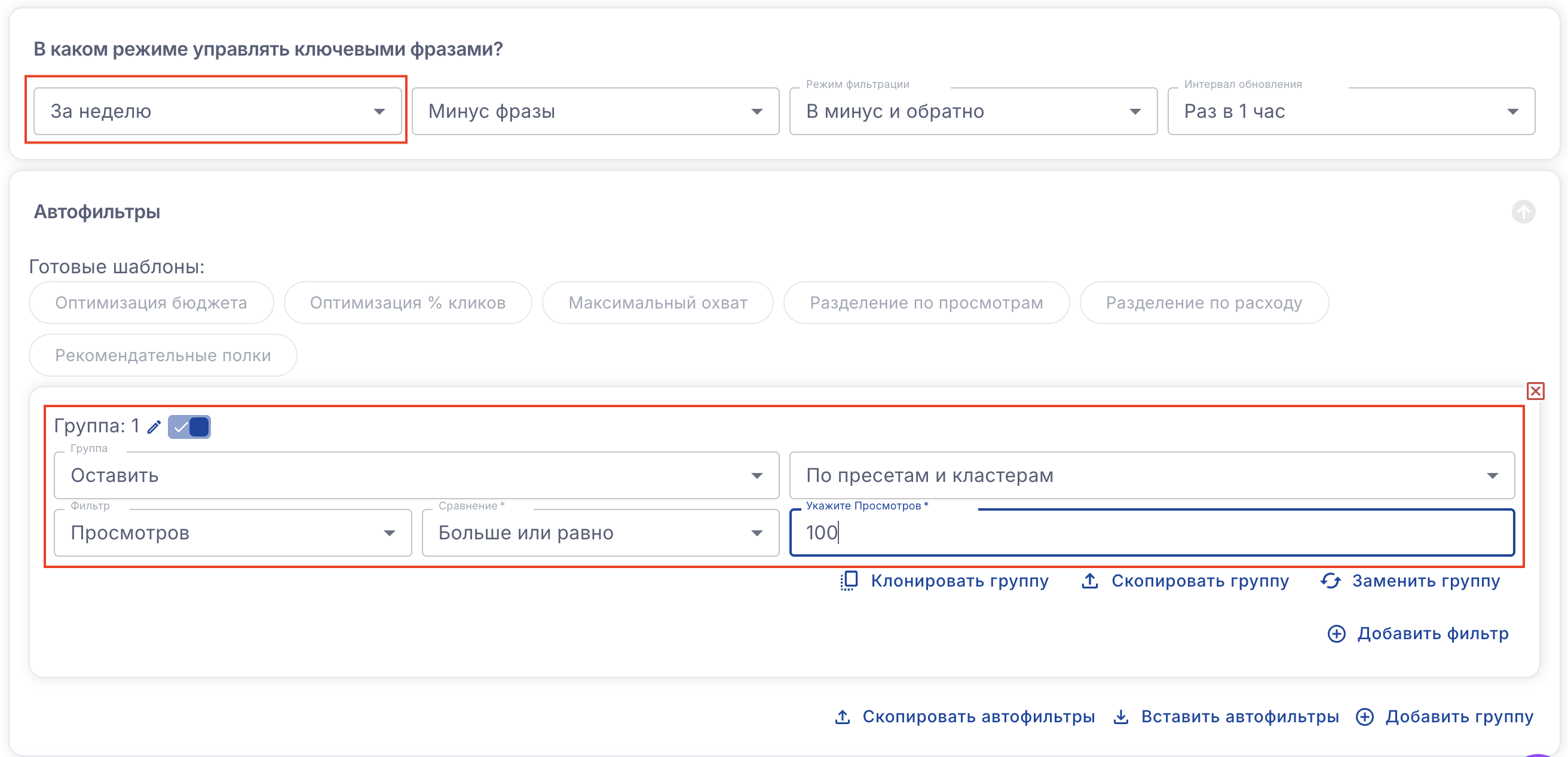 Например если в одной группе добавить фильтры по цене за клик и просмотрам, будут исключены или оставлены слова подходящие по двум параметрам сразу.