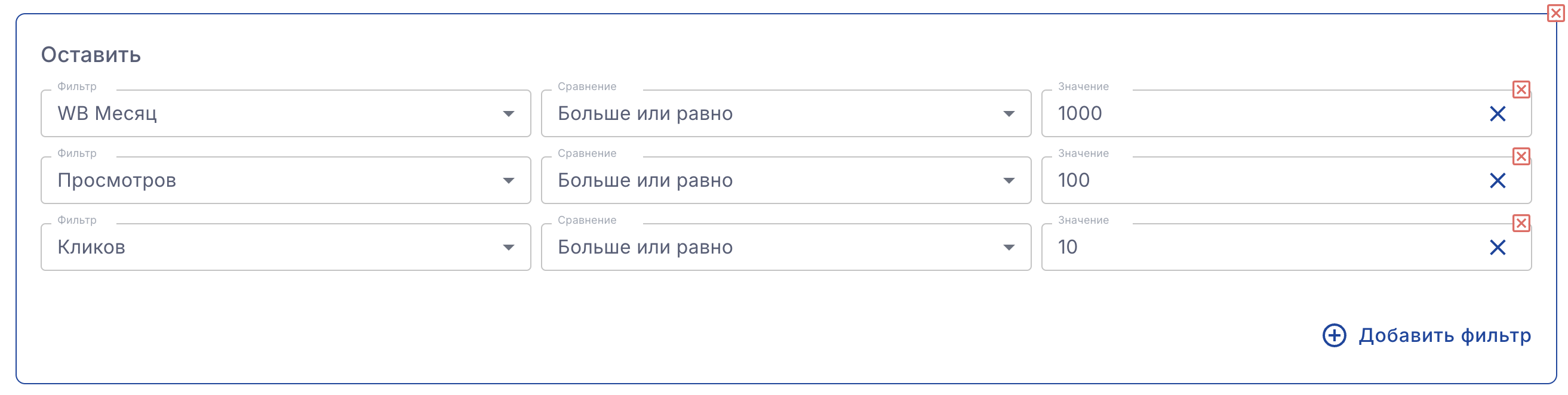 Например с помощью фильтра на скриншоте ниже, вы сможете оставить только ключевые фразы, у которых частотность на WB за месяц более 1000, просмотров более 100 и кликов более 10