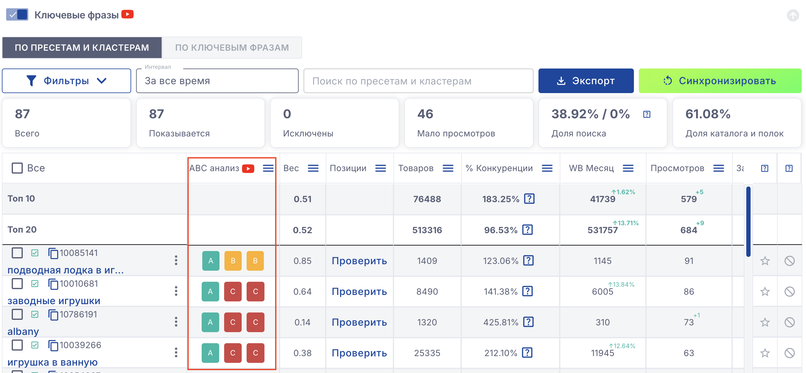 С помощью ABC анализа вы сможете быстро оценить насколько эффективен ключ по каждому из трех основных показателей (просмотры, %кликов, цена за клик)