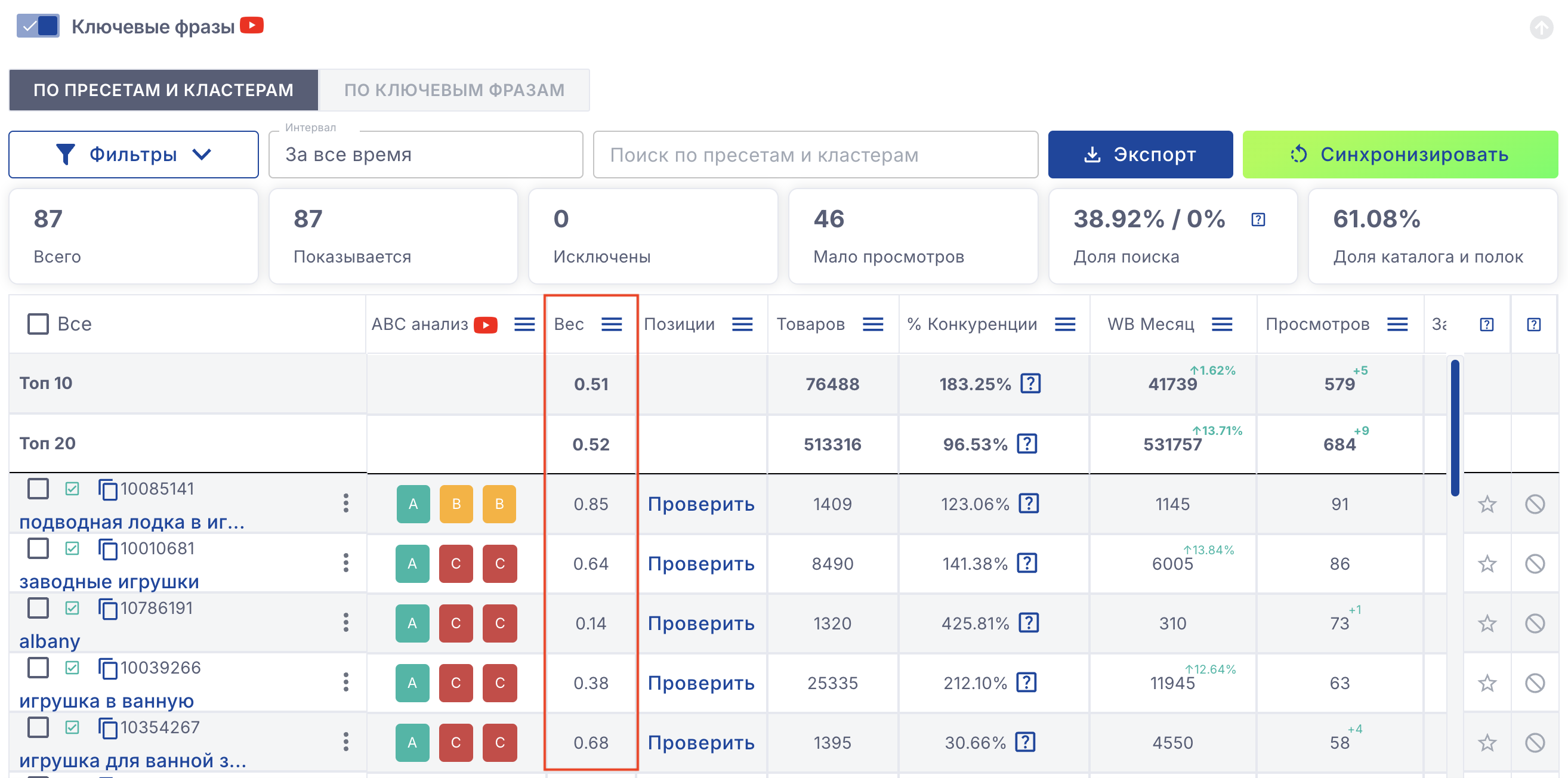 Сервис рассчитывает вес каждой ключевой фразы на основе ее показателей эффективности. Это позволит вам понять, насколько ключи выгодны для вашей рекламной кампании, и выбрать только самые значимые и продуктивные из них.