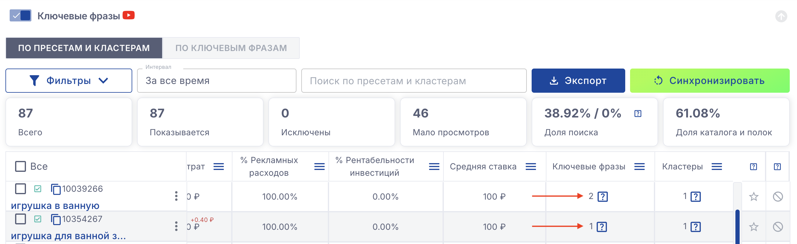 По пресетам и кластерам - ключевые фразы показываются объединяясь в пресеты