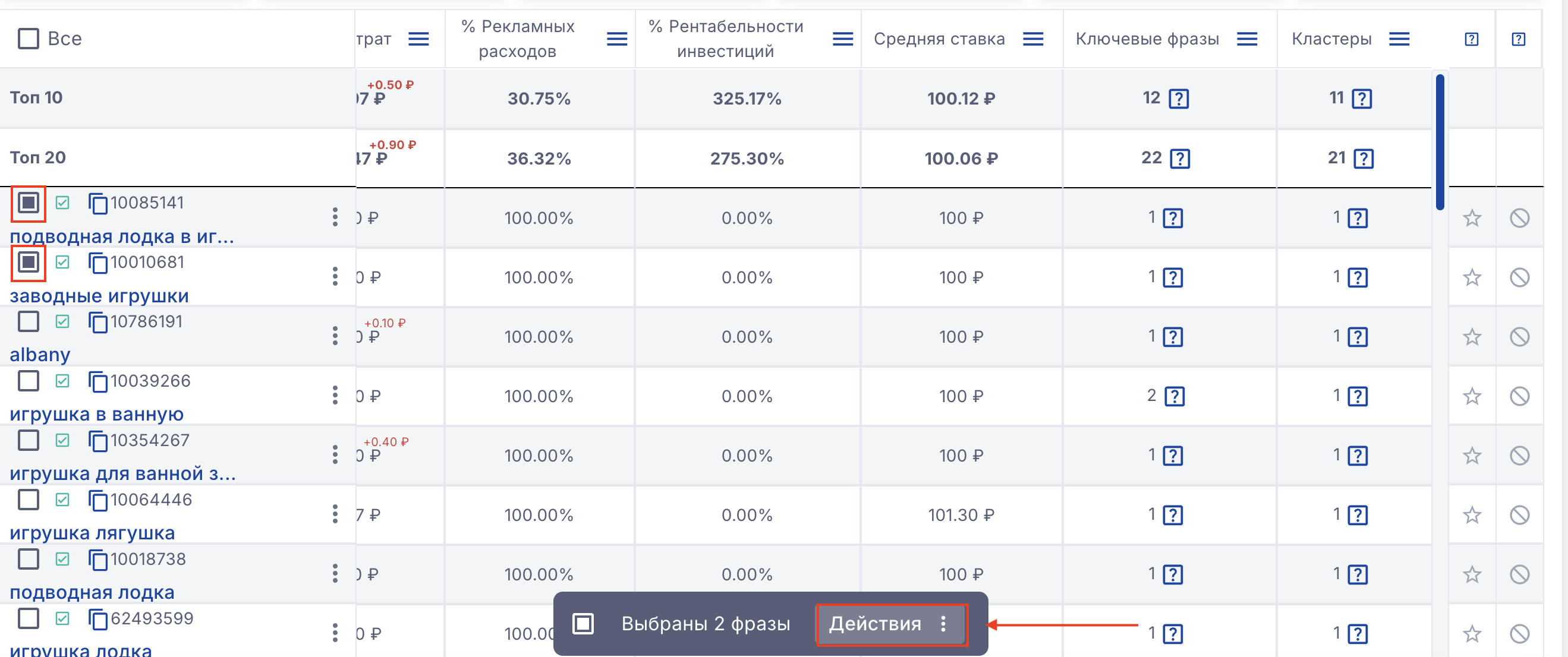 Топ - будут фильтроваться ключи или пресеты, которые входят в топ по % Рекламных расходов (ДРР). Чем ниже % рекламных расходов, тем выше фраза в топе. Например, чтобы оставить топ 100 пресетов, сделайте фильтр оставить - пресеты и кластеры - % Рекламных расходов - больше или равно - 100.