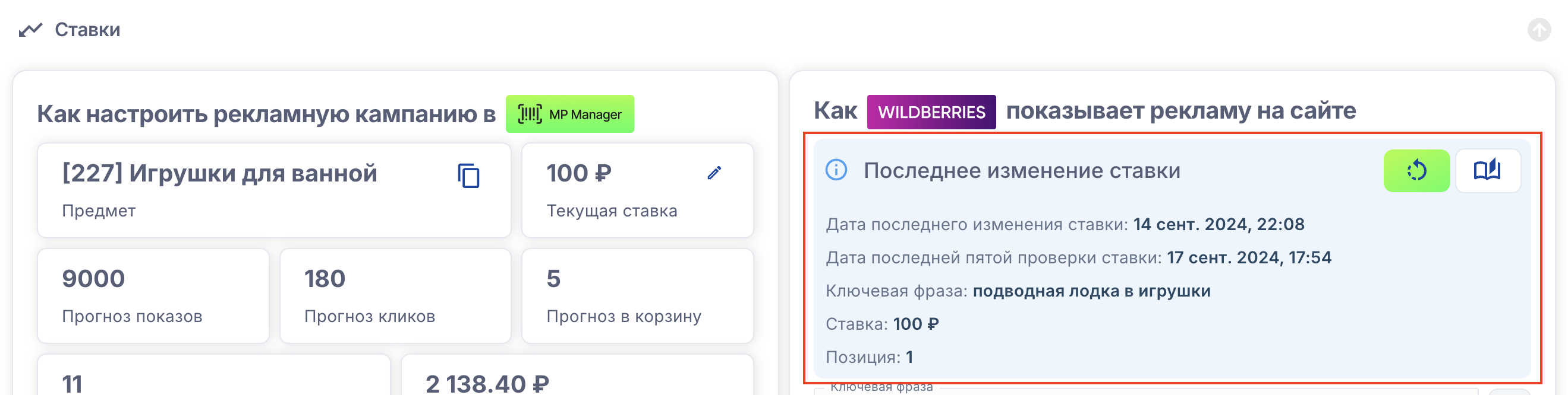 Ключевая фраза в этом блоке указывается только для просмотра выдачи и аукциона, чтобы проверить на каких позициях по ключам отображается ваш товар и товары конкурентов. Она не участвует в выставлении ставок. Стратегия выставления ставок настраивается в блоке "Настройка рекламной кампании MP Manager"