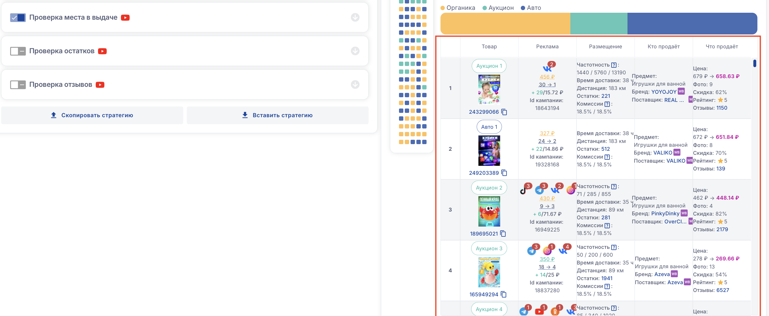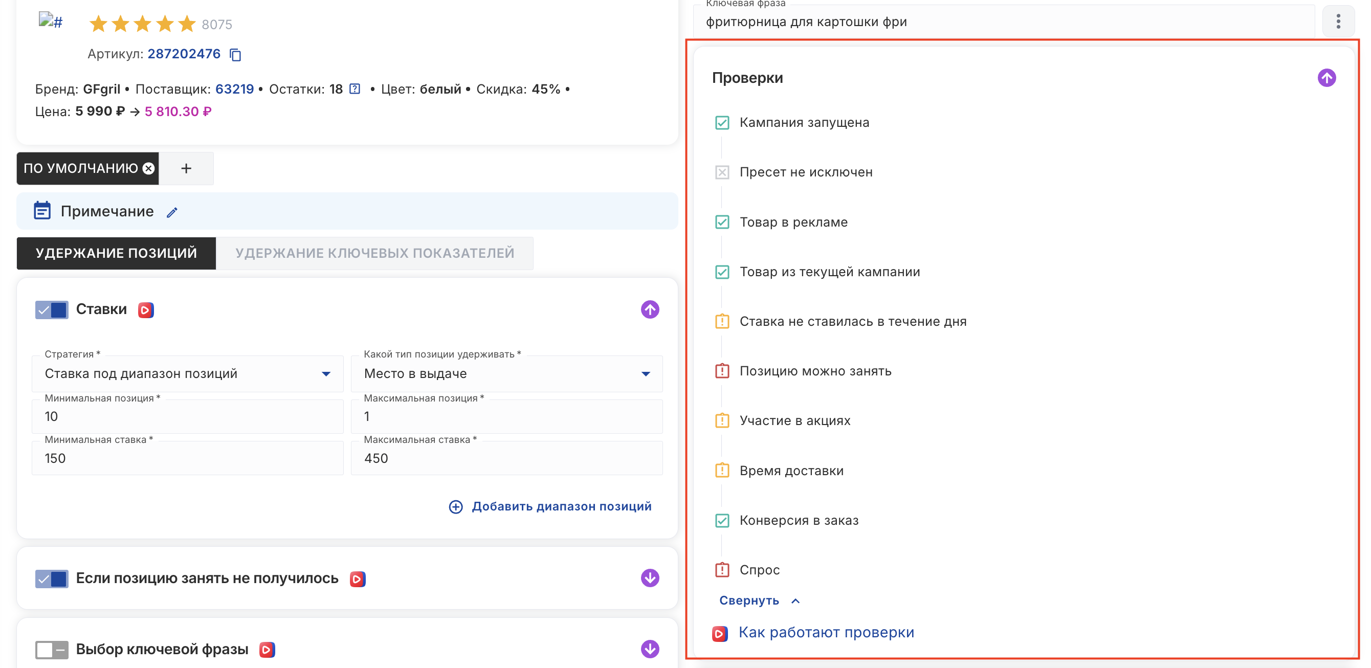 Также вы можете увидеть по какому ключевому слову была выставлена ставка - именно по этому слову позиции должны соответствовать настроенной стратегии. По другим ключам позиции могут отличаться, так как аукцион разный по каждому ключу