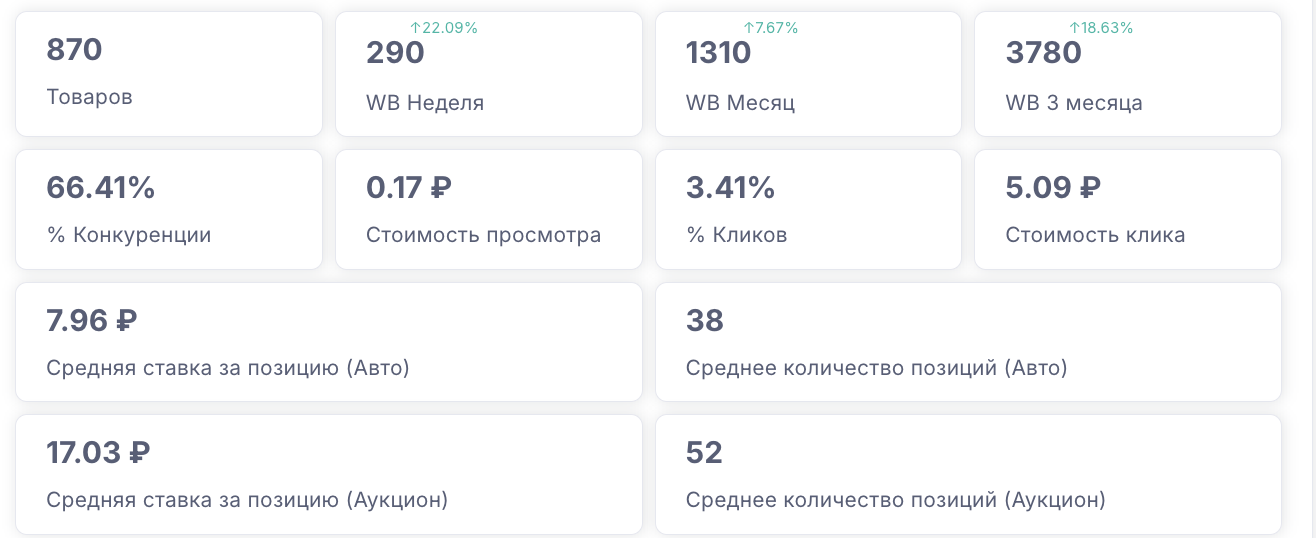 Информационный блок для просмотра позиций по ключам, анализа показателей ключей и проверок рекламы