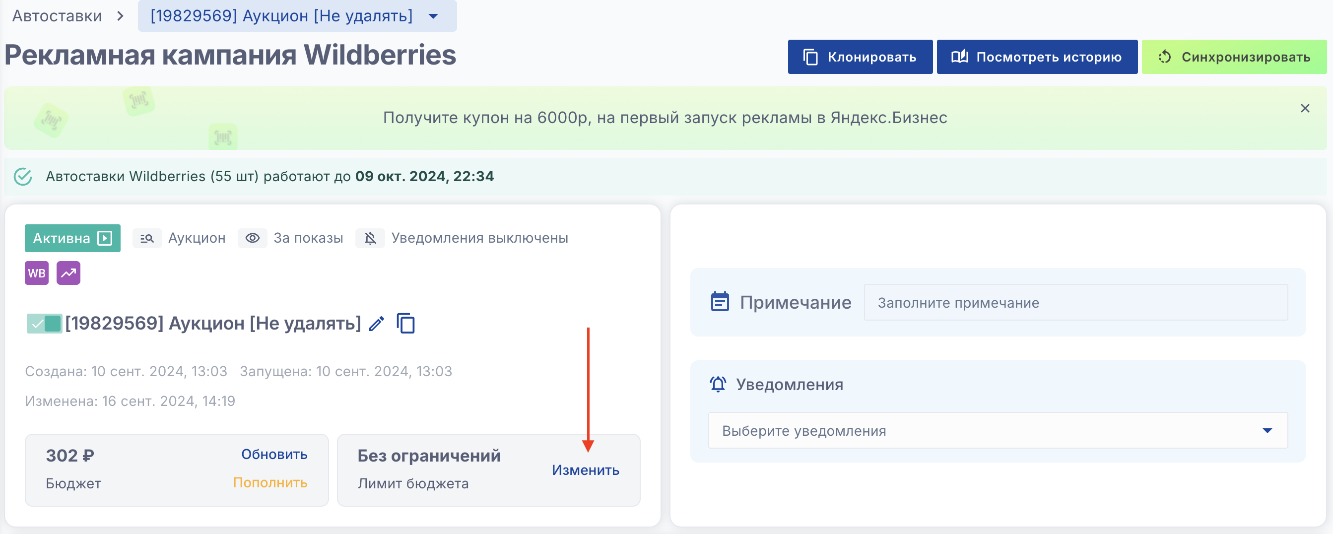 Нажмите "Изменить" в блоке лимита бюджета внутри рекламной кампании