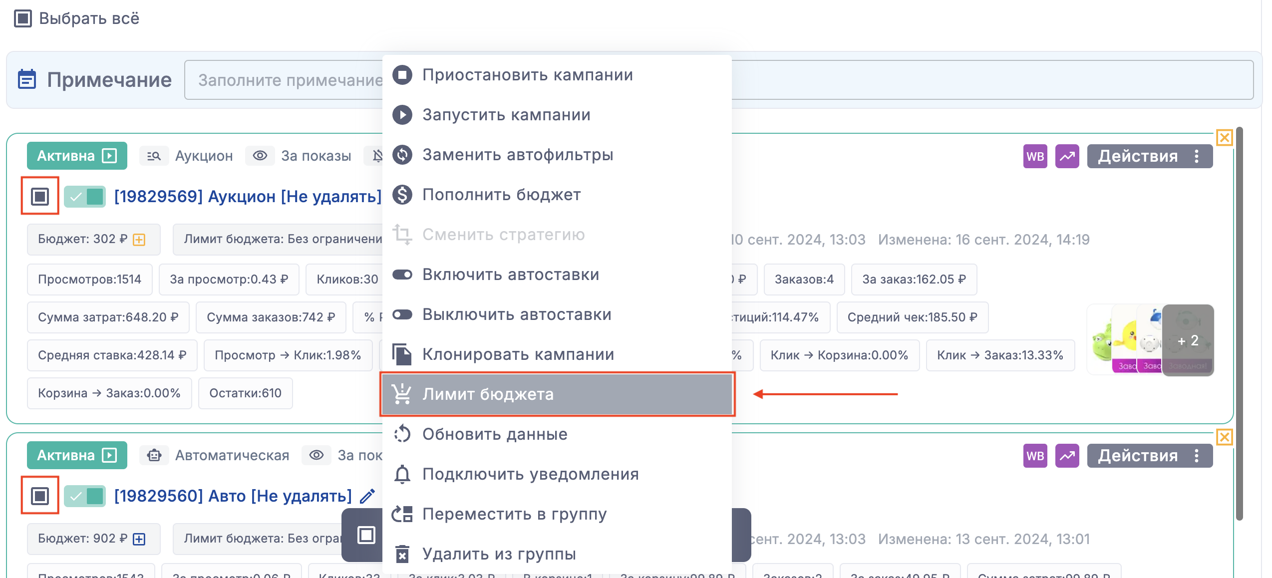 Или выберите несколько кампаний на странице списка кампаний, нажмите "Действия" и выберите "Лимит бюджета"