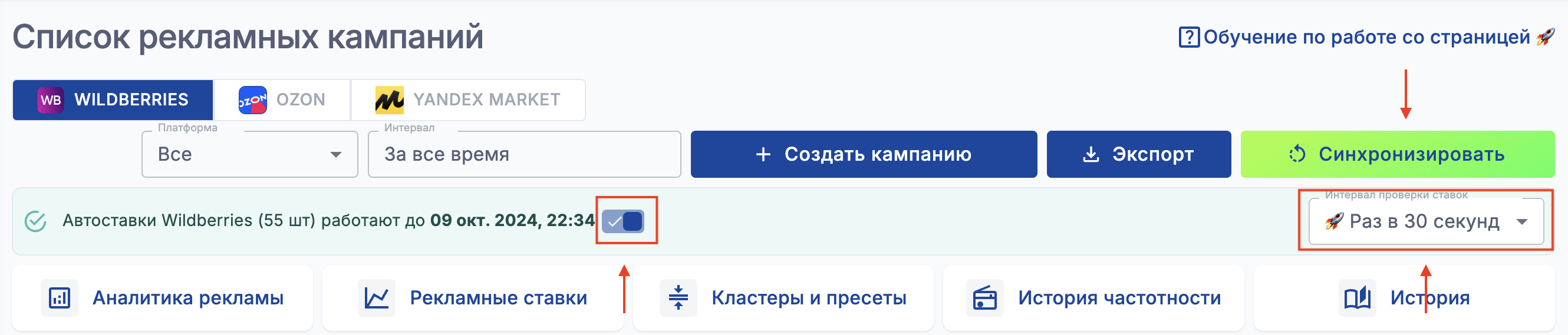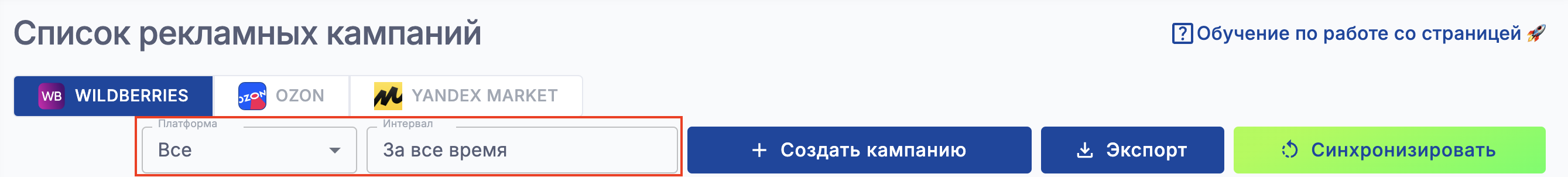Кнопка "Синхронизировать" обновляет список кампаний из API Wildberries.