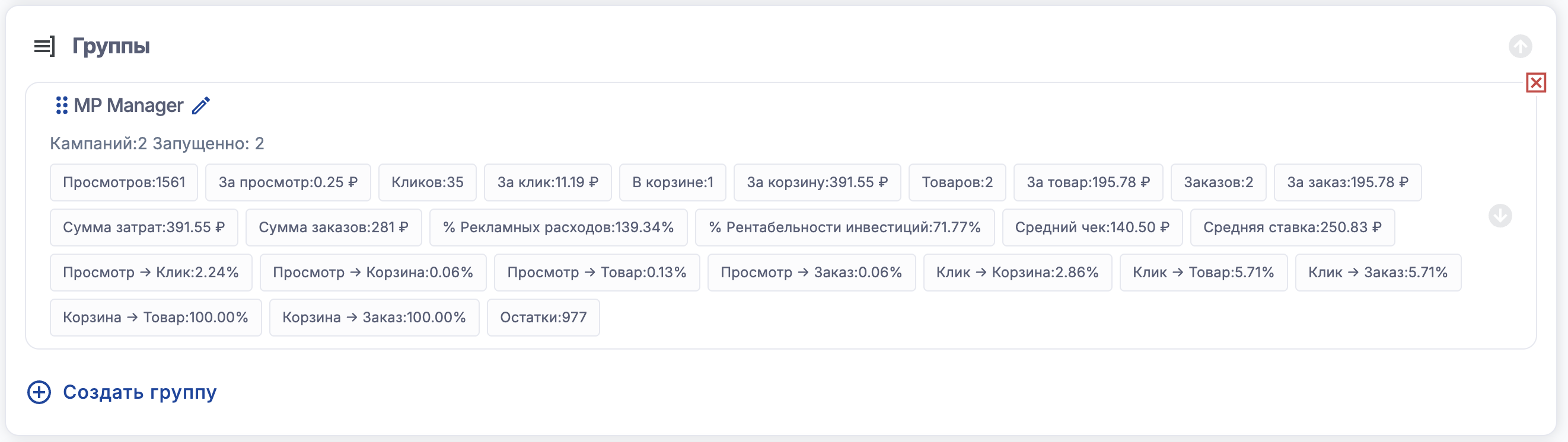 И также отображается статистика групп кампаний - это средняя статистика среди всех кампаний в группе