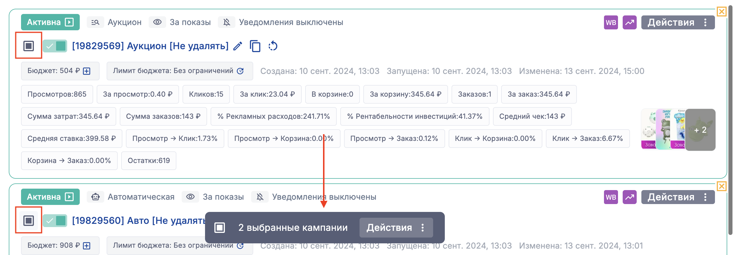 Выберите нужные кампании и нажмите "Действия" внизу экрана
