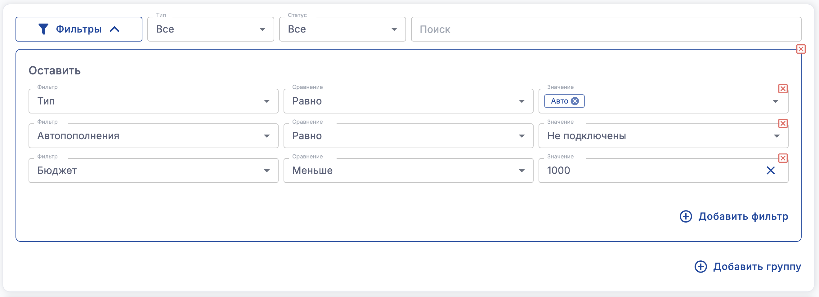 Например с помощью фильтра на скриншоте ниже, вы сможете оставить только Авто кампании с не подключенными автопополнениями и бюджетом меньше 1000р.