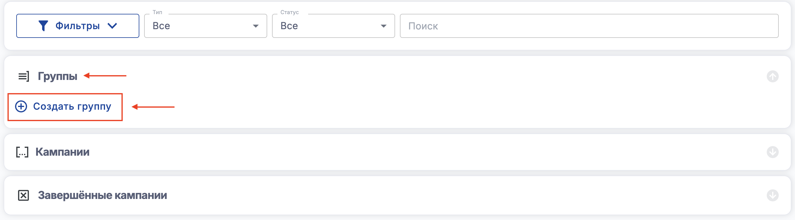 Вы можете искать кампании в списке или фильтровать их.
