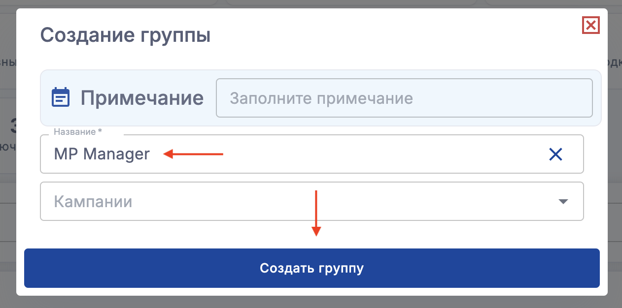 - В открывшемся окне введите название группы (вы можете сразу добавить кампании в группу или сделать это потом) и нажмите "Создать группу"