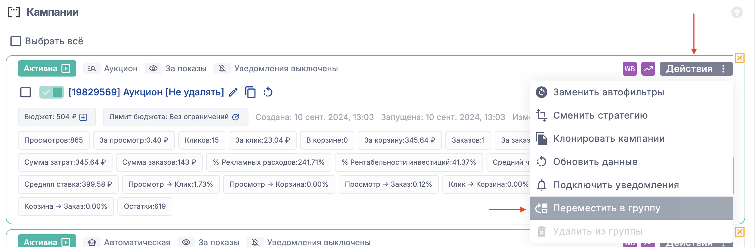 Нажмите кнопку "Действия" и выберите " Переместить группу", если вы хотите добавить в группу одну кампанию