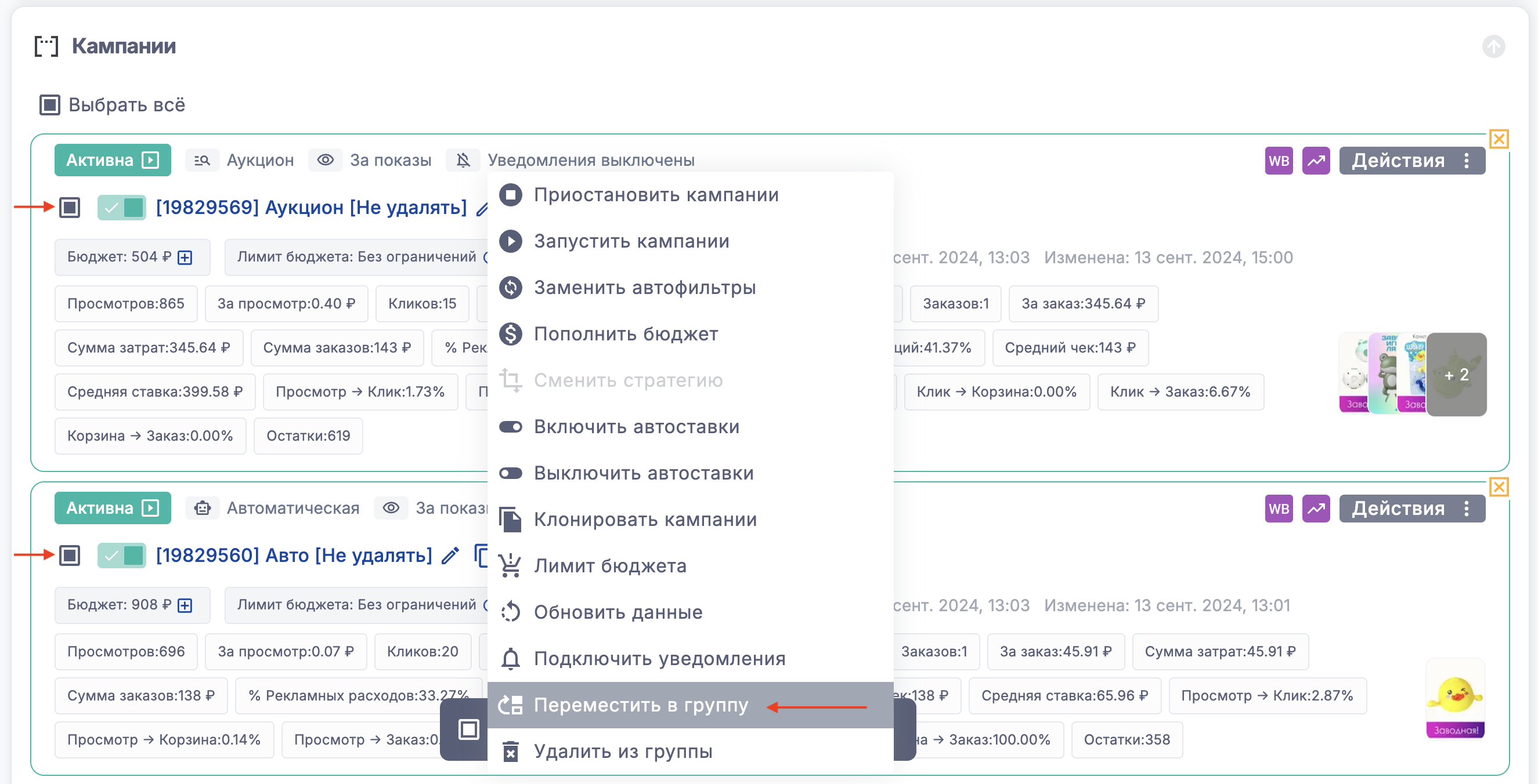 Или выберите несколько кампаний, нажмите кнопку "Действия" внизу экрана и выберите "Переместить в группу"