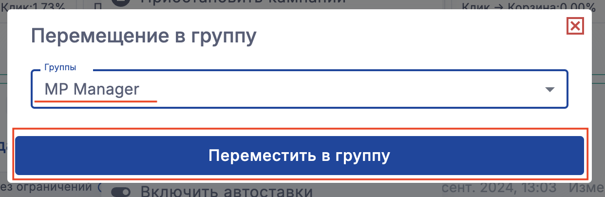 - Выберите группу, в которую хотите переместить кампании и нажмите "Переместить"