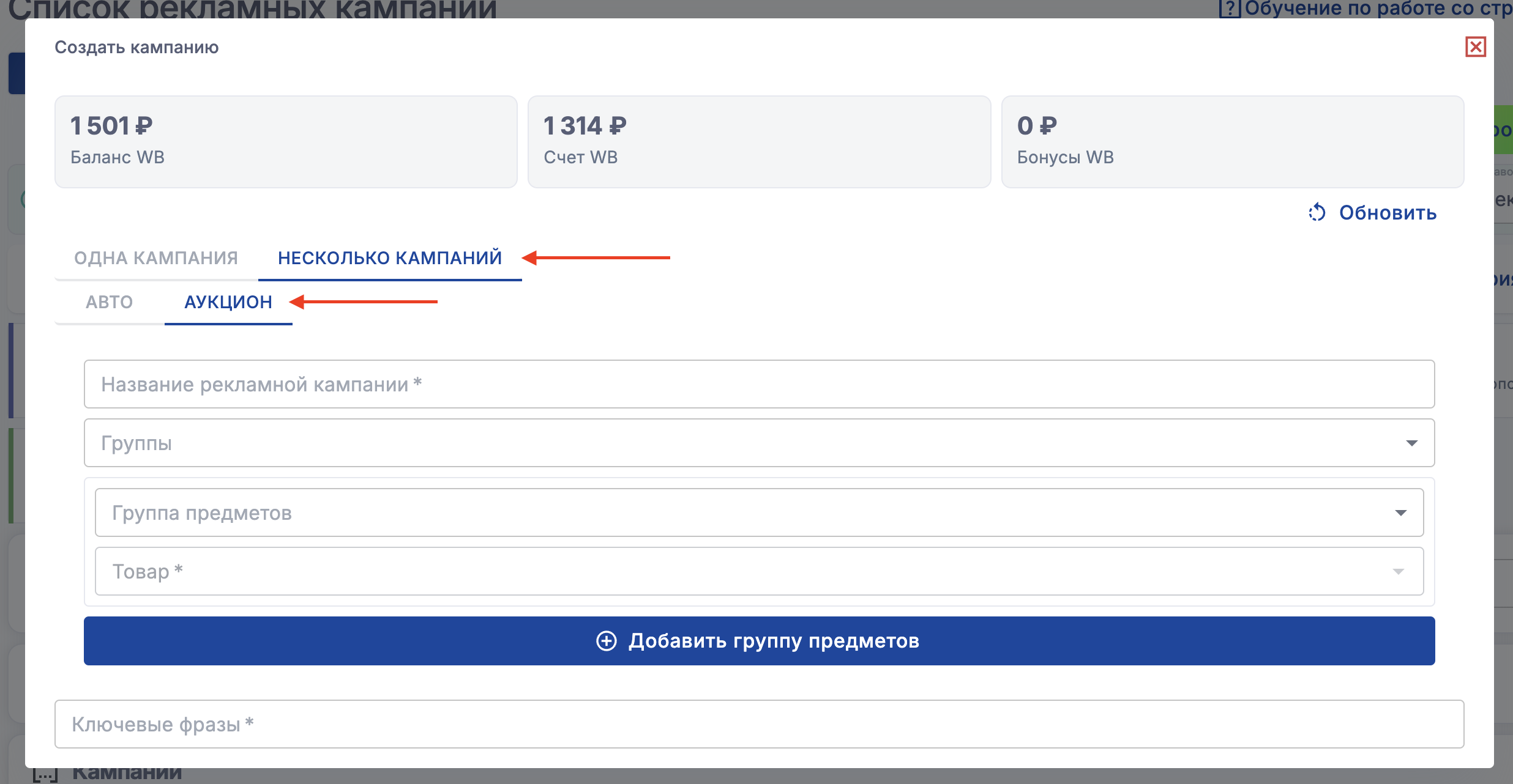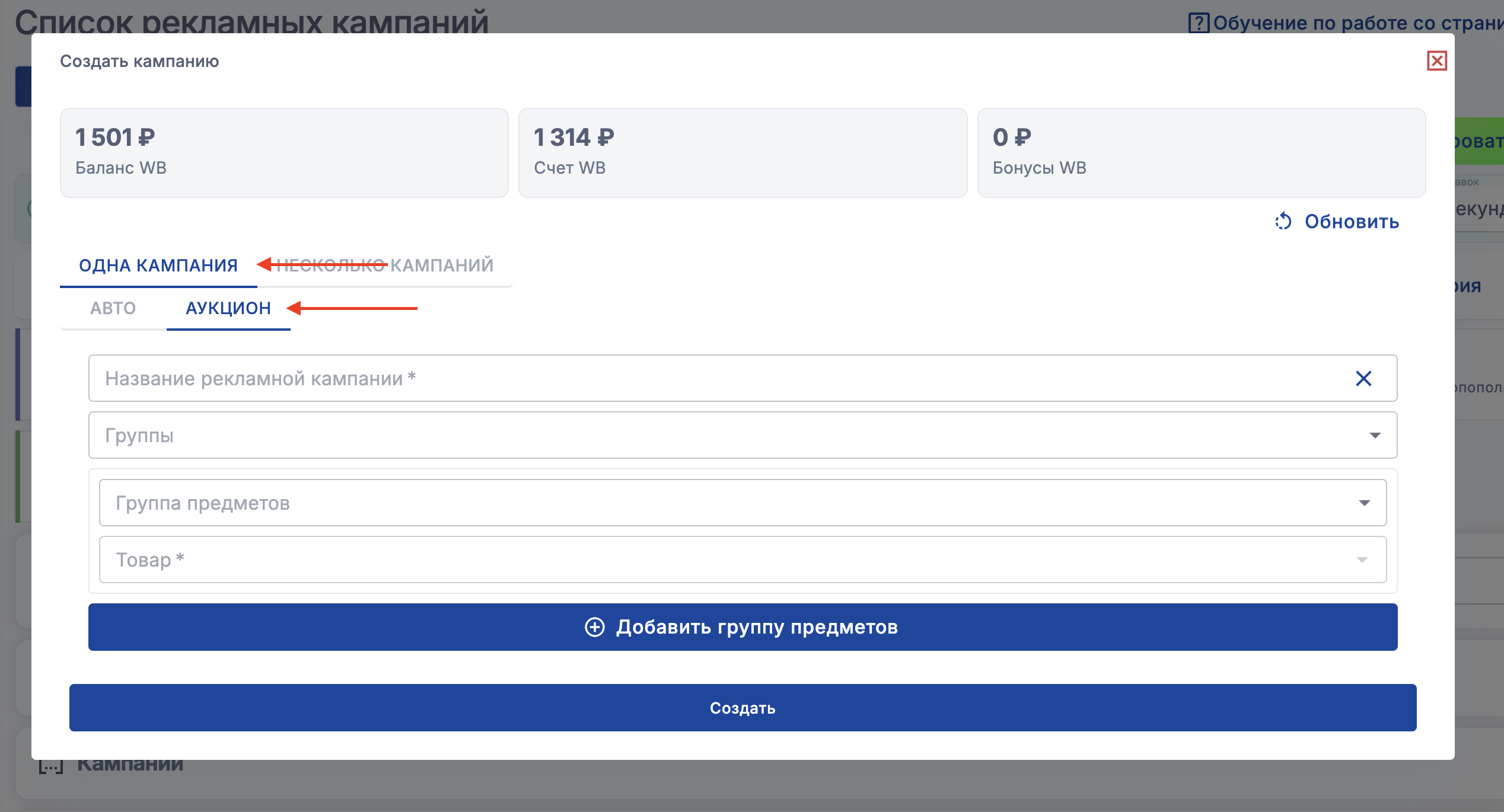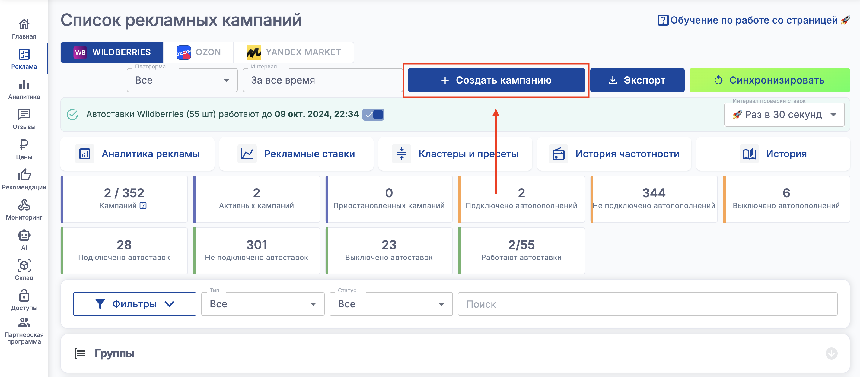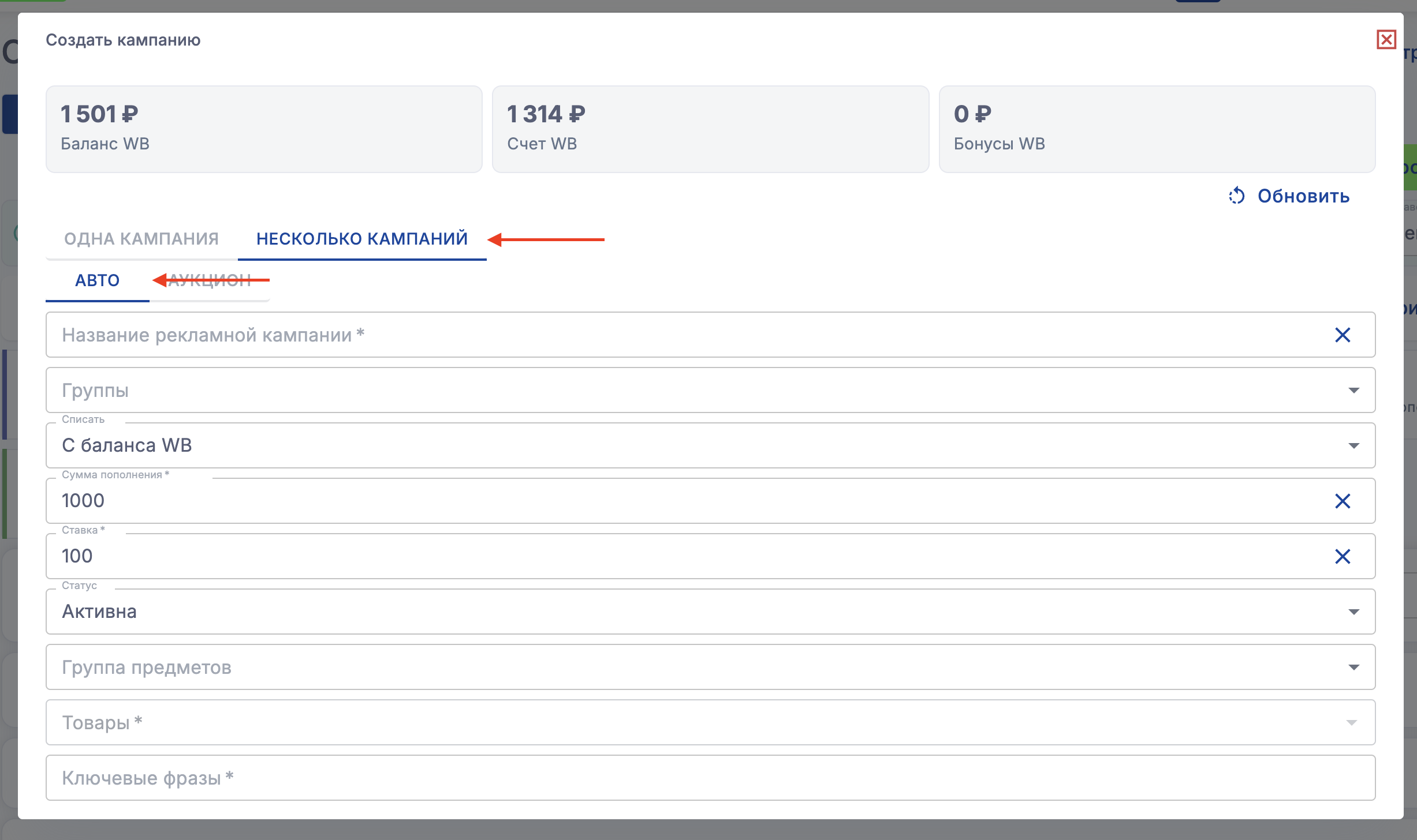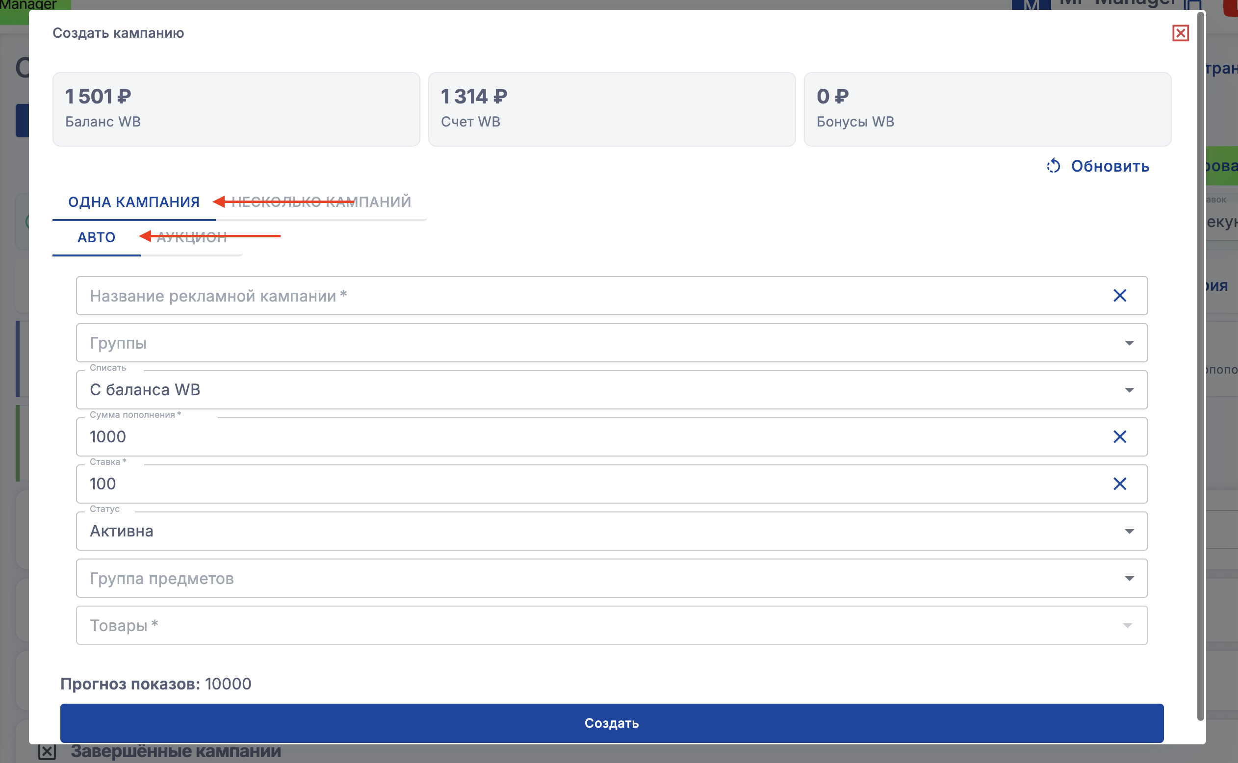 В сервисе можно создавать кампании аукцион и авто, также возможно создание сразу нескольких кампаний (1 кампания - 1 товар)