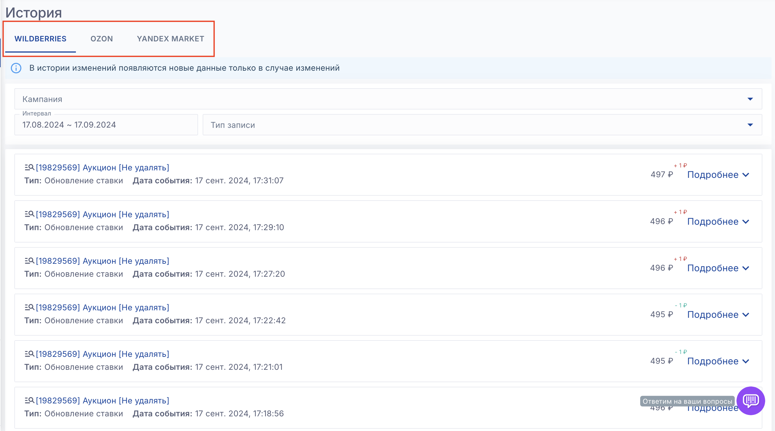Также сервис собирает историю изменений настроек, вы можете увидеть кто и когда менял какие-либо настройки