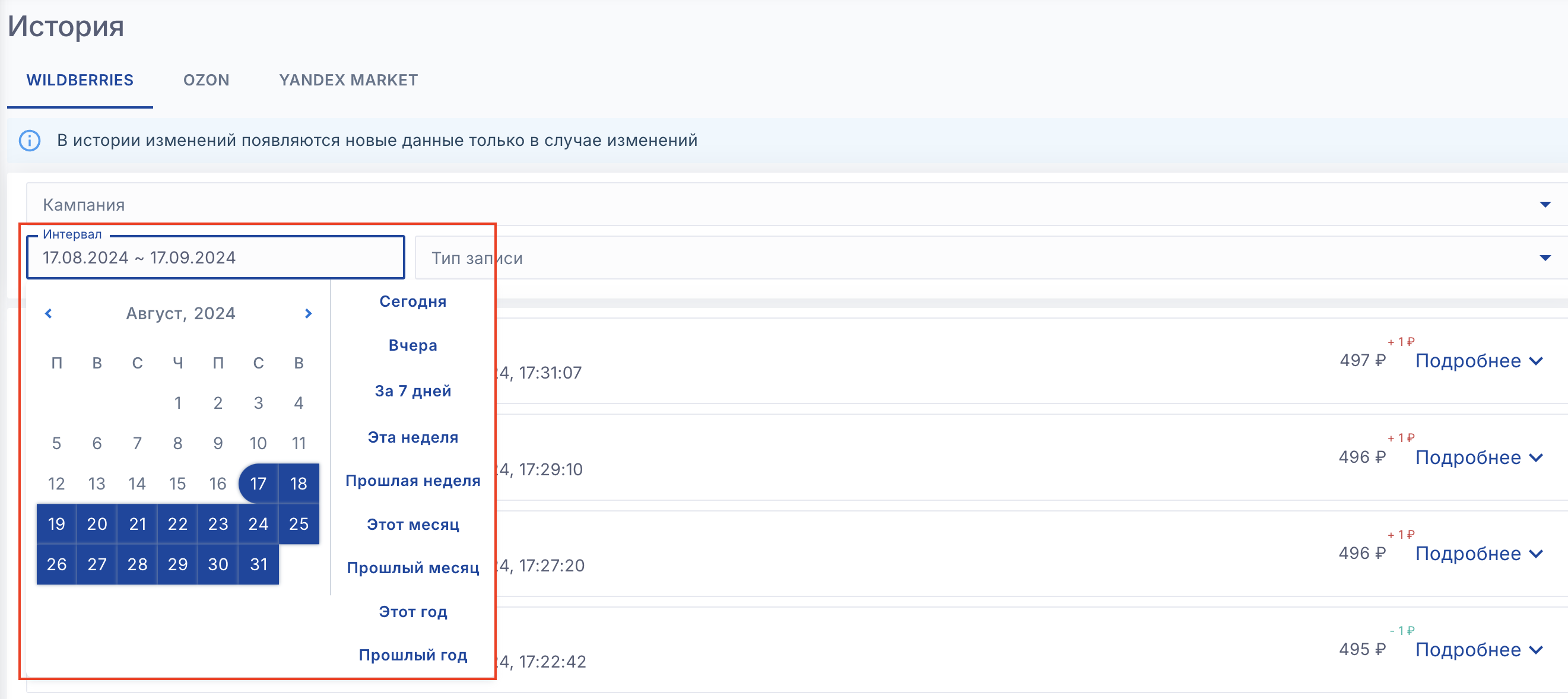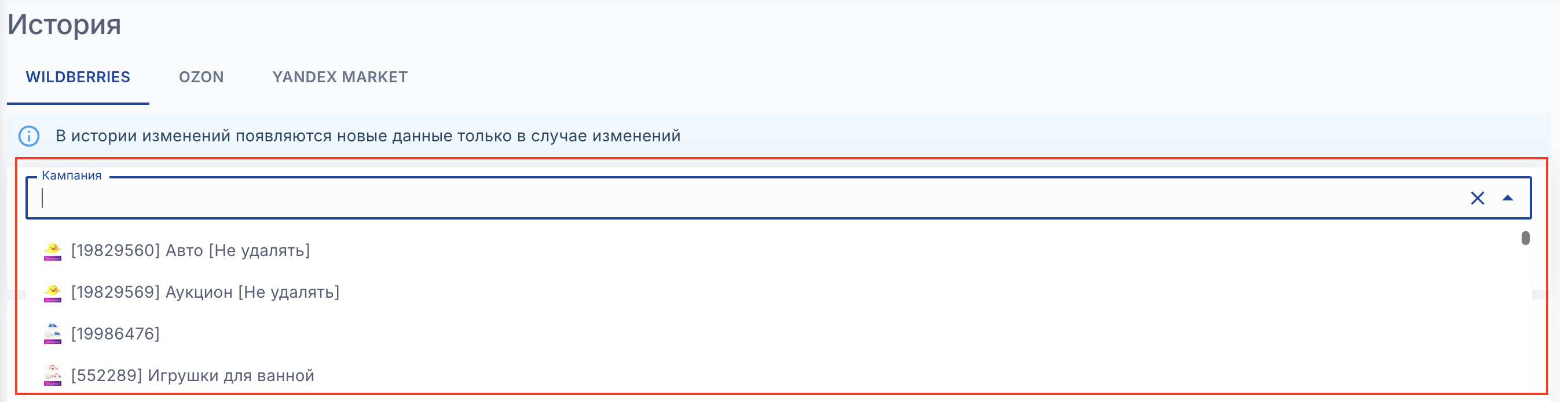 На странице "История" отображаются только действия сервиса.