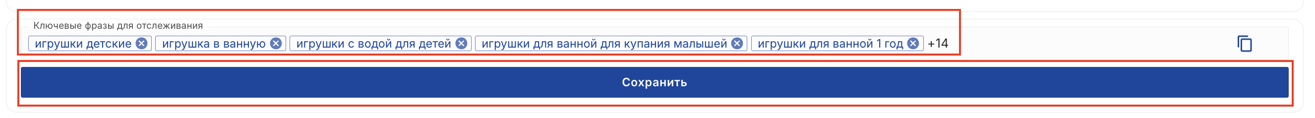 Введите до 20 ключевых фраз для отслеживания и нажмите сохранить. Данные могут появиться через некоторое время
