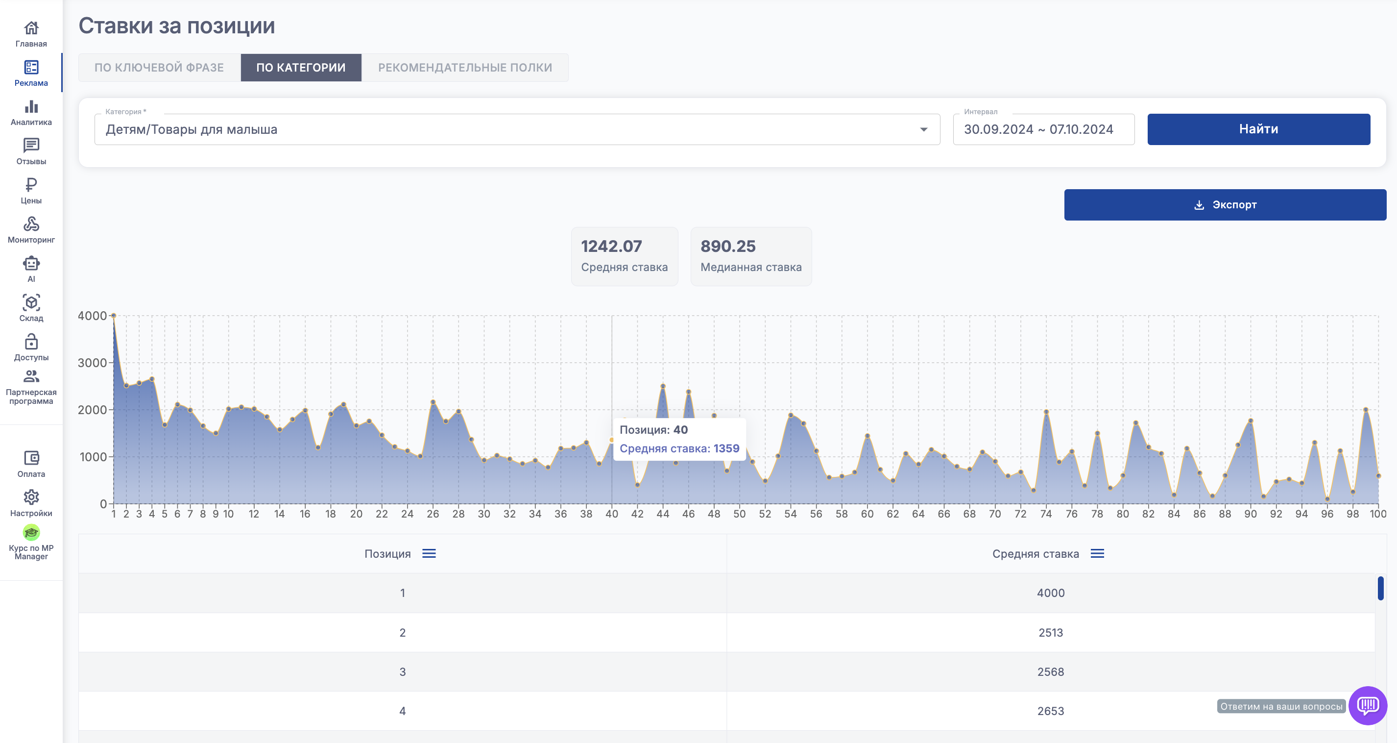 Страница показывает средние рекламные ставки за каждую позицию в выдаче по ключам, в категории или в карточке товара (по товару)