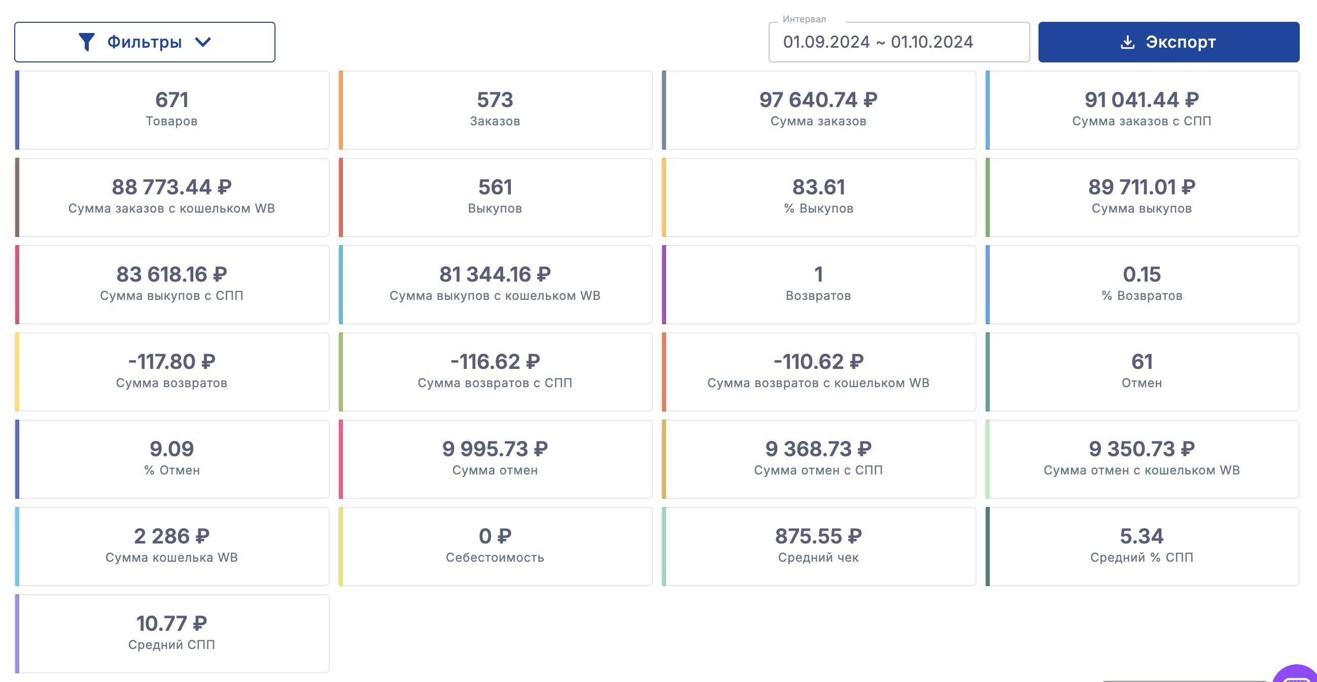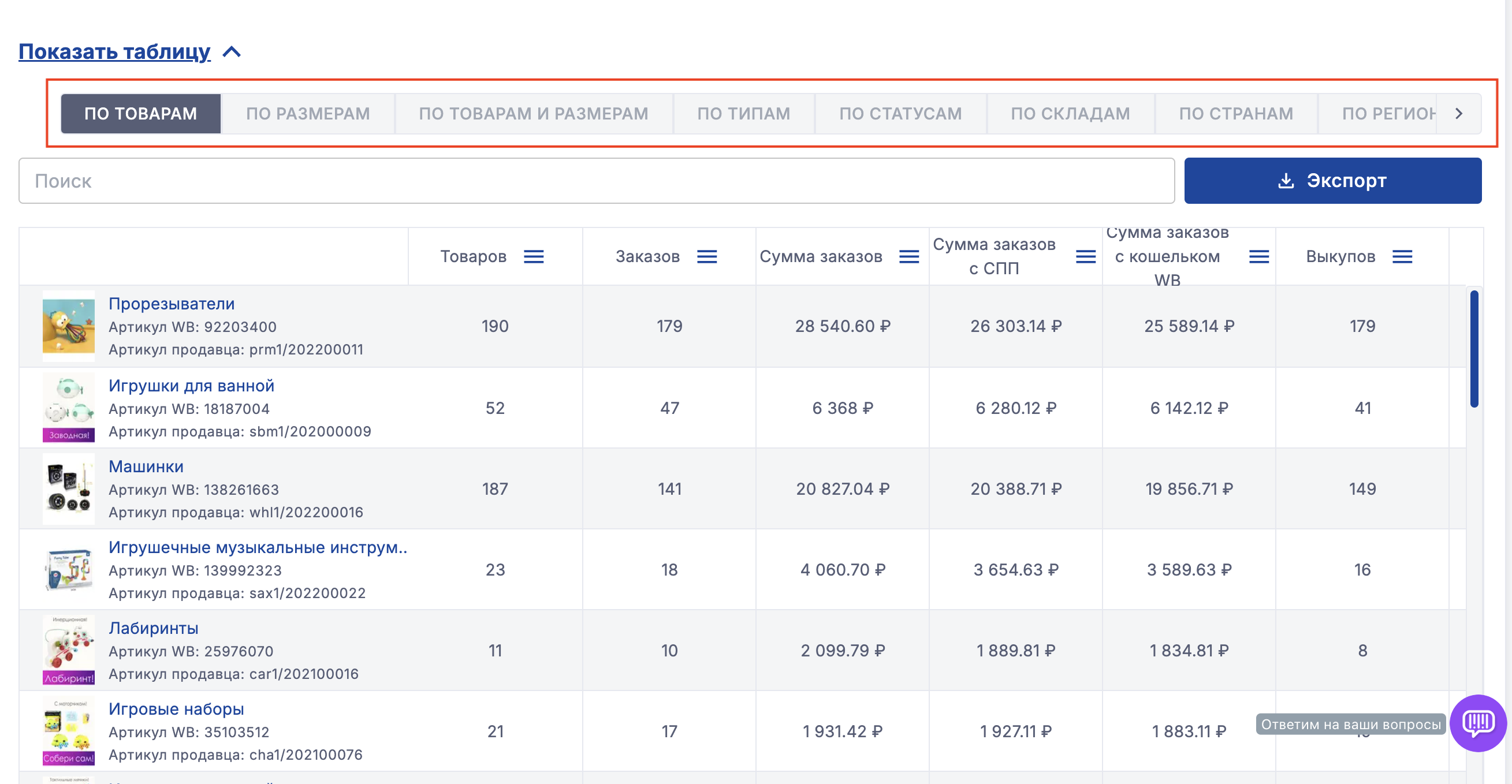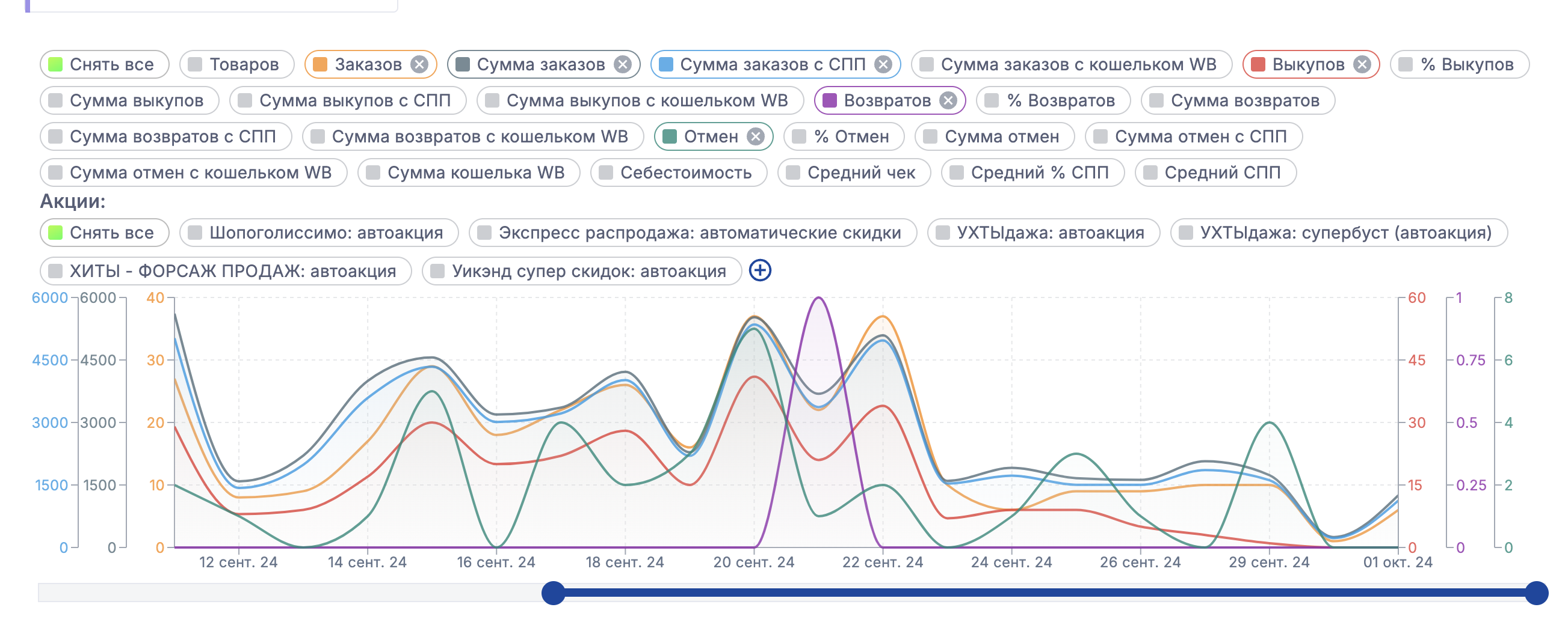 Можно проанализировать данные по заказам, выкупам, отменам, сумме выкупов СПП и другим параметрам по любому товару