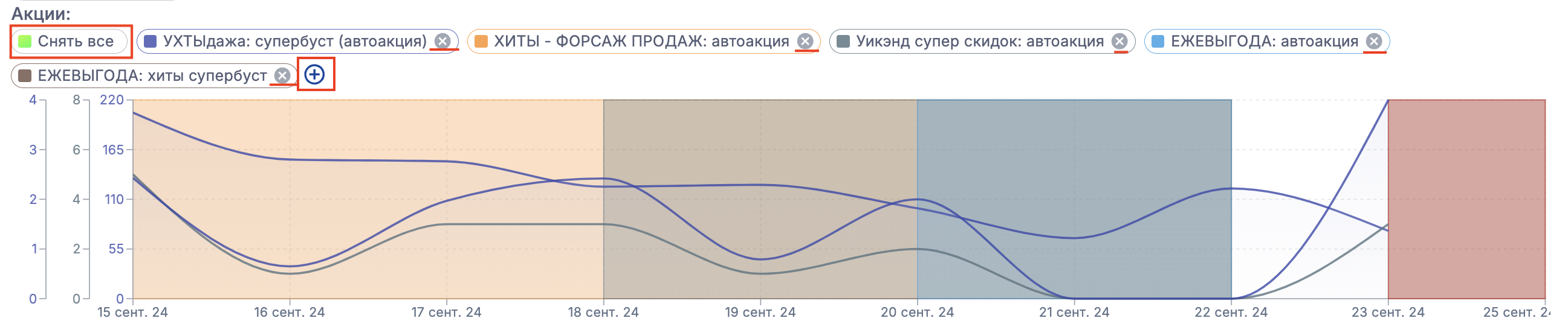 На графике отображаются все акции, проходившие в выбранный интервал времени. При необходимости вы можете убрать некоторые или все акции