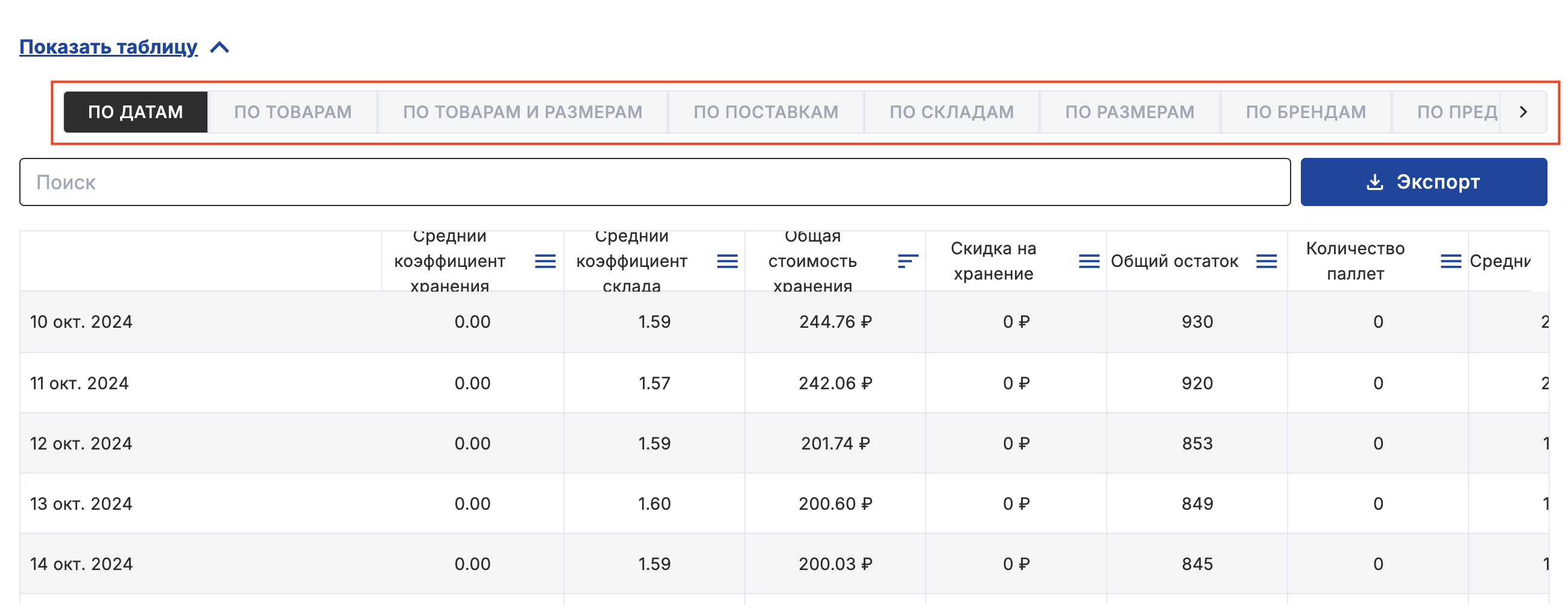 С помощью этой страницы вы можете точно определить стоимость хранения за выбранный период на каждом складе для каждого товара и сравнить стоимость хранения по складам