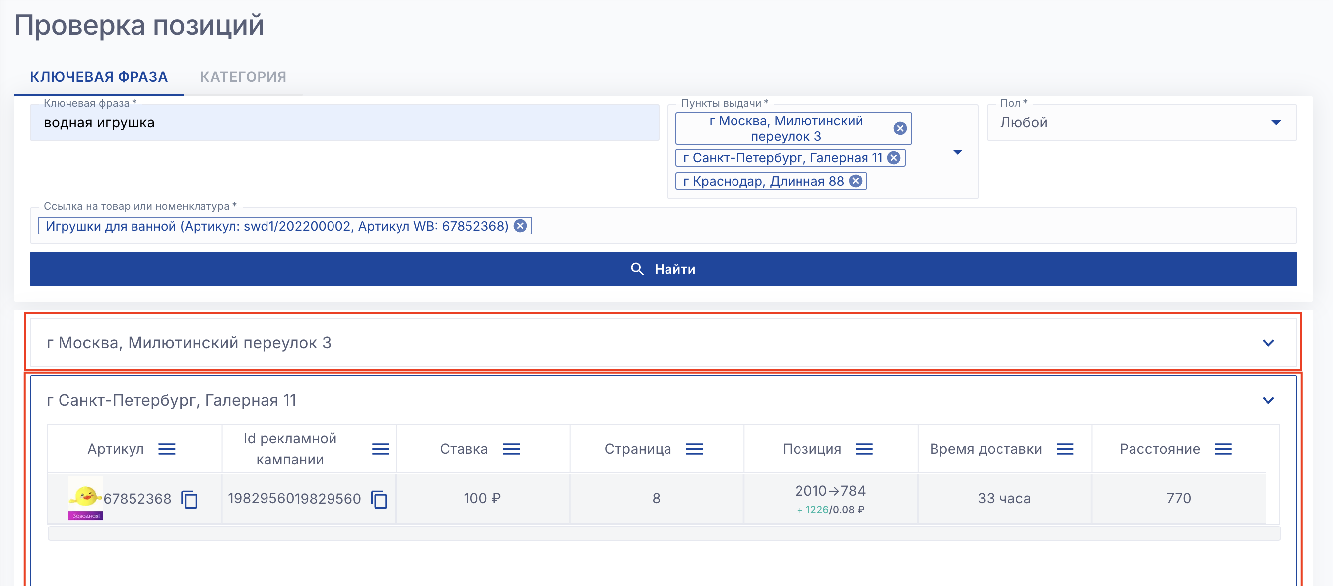 Позиции товаров можно проверить во всех регионах по любому ключу или по категории