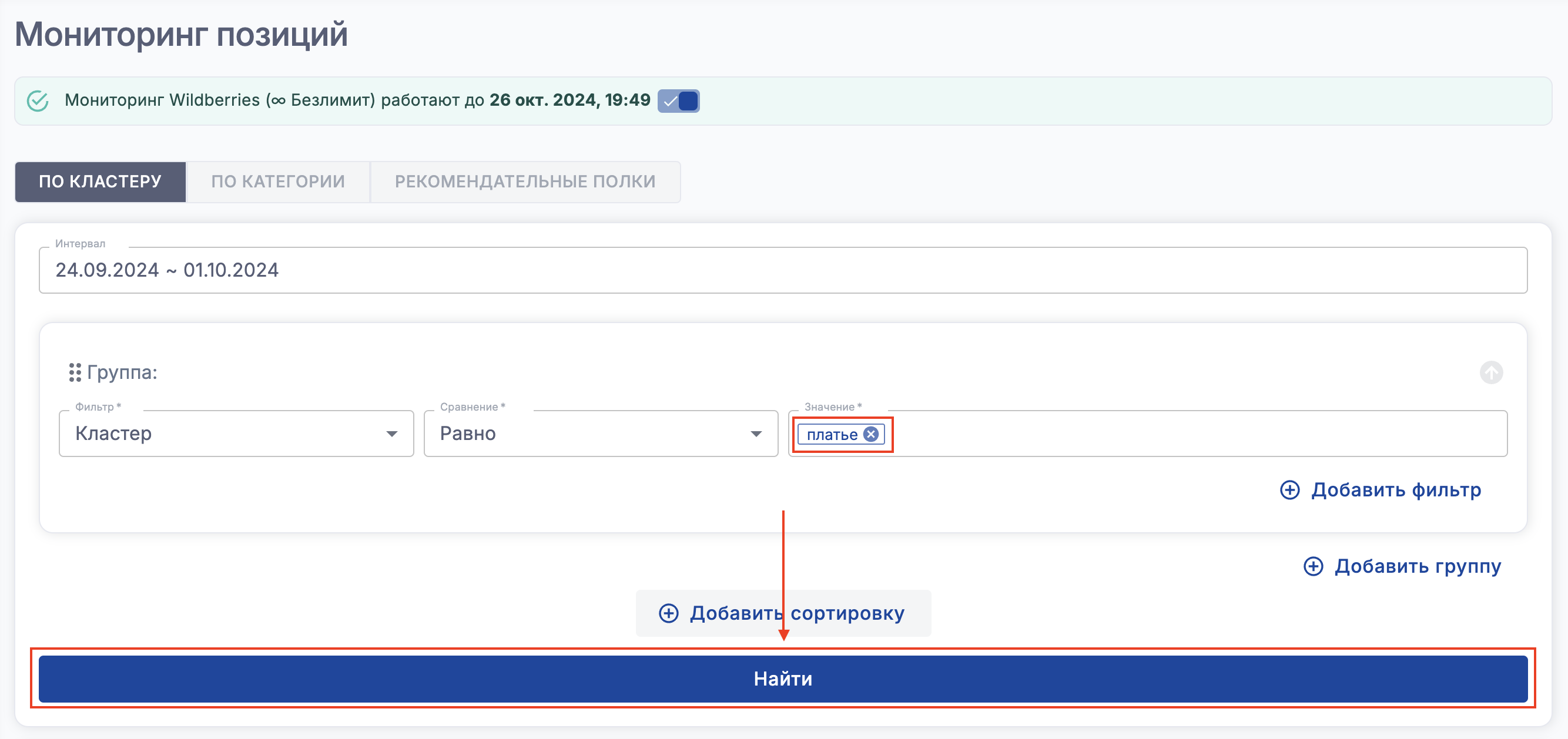 Вам нужно указать кластер (например "платье") в поле, нажать Enter и нажать "Найти"